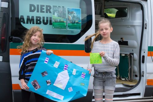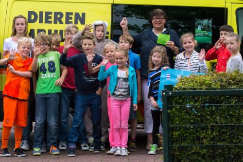 Geplaatst op:14-07-2014 Bijgewerkt op:14-07-2014 16:57 Gulle donatie dankzij kinderen AndersenschoolBron: Dierenhulpverlening Woerden e.o., Patrick HuyskensOnlangs heeft de Stichting Dierenhulpverlening Woerden e.o. een flinke donatie in ontvangst mogen nemen namens de leerlingen van de Andersenschool. Dankzij hun enthousiasme kwam middels een sponsorloop het geweldige bedrag van maar liefst € 1.275,- beschikbaar voor onze Stichting! Drie bestuursleden en twee ambulancechauffeurs trokken er afgelopen woensdag met twee dierenambulances op uit om de cheque in ontvangst te nemen. De leerlingenraad van de Andersenschool mocht voor de jaarlijkse sponsorloop zelf een goed doel aandragen dat een deel van de opbrengst zou krijgen. Dat de gift ten goede moest komen aan de dieren was al snel duidelijk. In overleg met de leerlingenraad wordt het gedoneerde bedrag gereserveerd voor een mooie EHBO-koffer voor de nieuw aan te schaffen dierenambulance en voor goed licht bij het hondenuitrenveld bij het dierenasiel Reijerscop in Harmelen. Nina en Marthe-Hanne hadden een prachtige cheque gemaakt die nu in het dierenasiel hangt. Na de overhandiging van de cheque was er uiteraard voor de kinderen gelegenheid om onze ambulances – en bijgehorende zwaailichten – te bewonderen. Overhandiging cheque op woensdag 9 juli 2014