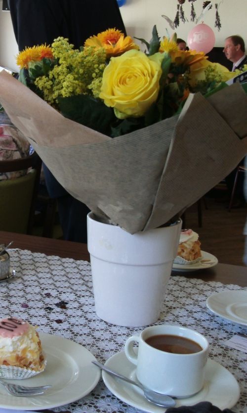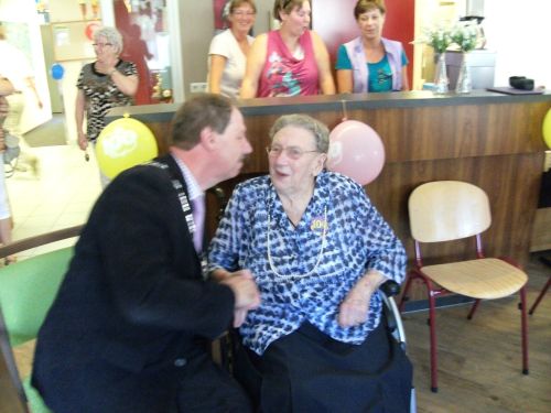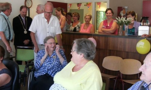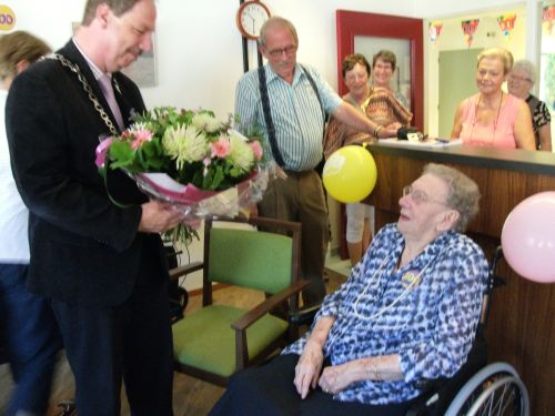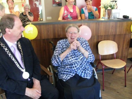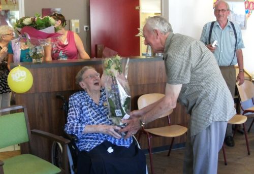 Geplaatst op:05-08-2014 Bijgewerkt op:05-08-2014 12:03 “Moet de burgemeester geen stoel hebben?”Bron: Nettie Kuijer, redactie Radio Stad Montfoort. Gegevens o.a. via zoon PietDe vlag hing uit bij dinsdag 5 augustus bij woonzorgcentrum De Lindescote, waar Willemijntje Romijn- de Graaf haar 100-ste verjaardag vierde, samen met familie, vrienden en medebewoners. Loco burgemeester Rob Jonkers kwam de oudste inwoonster van de gemeente Montfoort feliciteren en gaf haar een mooie bos bloemen en een zoen. Blozend nam de jarige de zoen in ontvangst. Nee, in haar hele lange leven was ze nog nooit door een burgemeester gekust, vertelde ze lachend. “Noem me maar Wil,” zei ze. “Willemijn is mijn doopnaam.” Trots vertelde ze dat de koning en de koningin haar een felicitatie hebben gestuurd, die nu ingelijst op haar kamer hangt. “Die heeft hij heus niet zelf geschreven hoor,” zei ze gniffelend. Terwijl ze van haar koffie nipte bekeek Wil alle bloemen “Ik weet niet meer van wie ik die allemaal gekregen heb.” Toen viel haar oog op locoburgemeester Rob Jonkers. “ Moet de burgemeester geen stoel hebben?” vroeg ze alert. kllll.jpg) | Wil is geboren in Kamerik, waar haar vader notabel en rietdekker was. Ze trouwde in 1943 in Stadskanaal. Ondanks dat haar man een vrijstelling had werd hij toch weggevoerd naar Duitsland en bleef ze achter met twee kinderen. Ze verhuisde naar Linschoten waar ze de zaak overnam. Inclusief alle bouwkundige werk van landgoed Linschoten. De werkplaats was naast hun woning aan de Engerzandweg. Altijd was er rommel en houtstof in huis, steeds drie of vier mensen in de werkplaats, die meeaten aan de keukentafel. Er was weinig tijd voor vakantie. In haar gezin, met haar zonen Kees en Piet, heeft ze veel geluk ervaren. Wil heeft een rijk nageslacht. Ze is erg betrokken met haar kinderen kleinkinderen en achterkleinkinderen en vergeet niet gauw een verjaardag. Ze puzzelt graag, met hulp van een loep, en kijkt TV. Vooral quizzen waardeert Wil. Wil is heel blij met de inzet en betrokkenheid van personeel en vrijwilligers. Schoondochter Meta zet zich al vele jaren in als mantelzorgster, aankleden, uitkleden, naar bed brengen en alles wat daarbij komt kijken. Zonder klagen, zo’n 20 uur per week, met liefde gedaan. Wil ervaart haar leven temidden van kinderen en kleinkinderen dankbaar en zinvol, en put haar kracht uit het geloof in God.