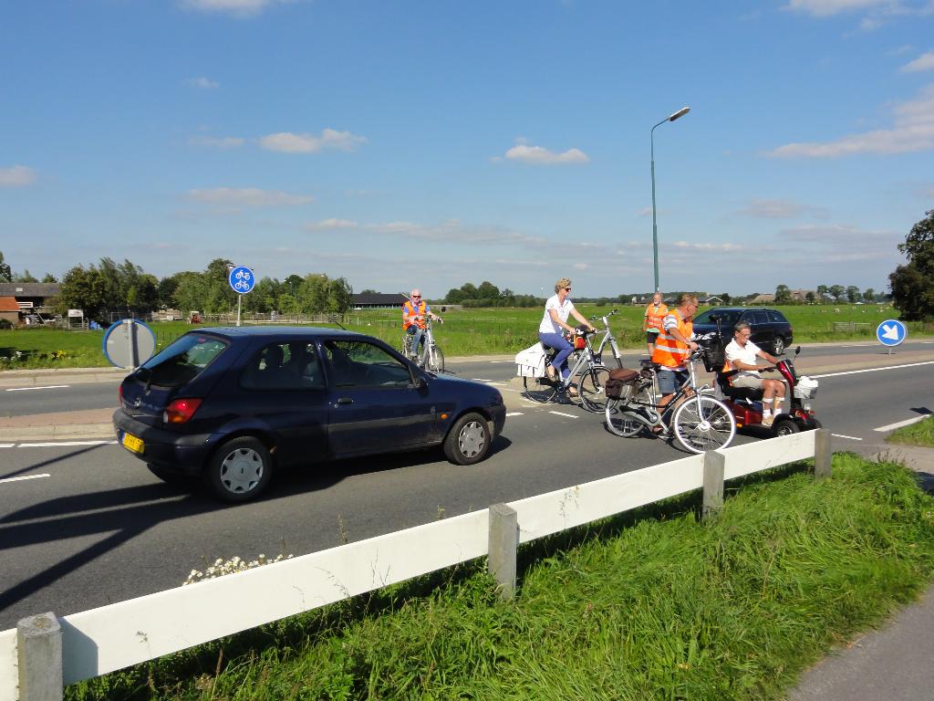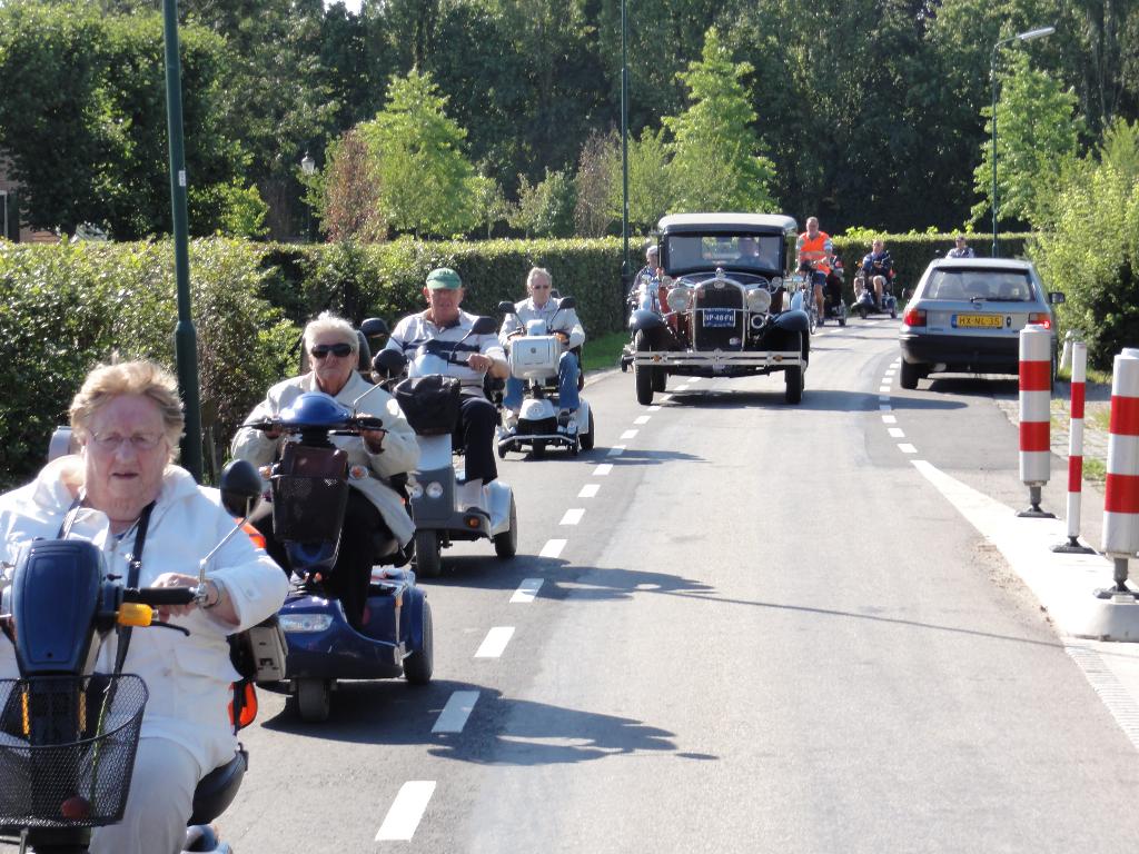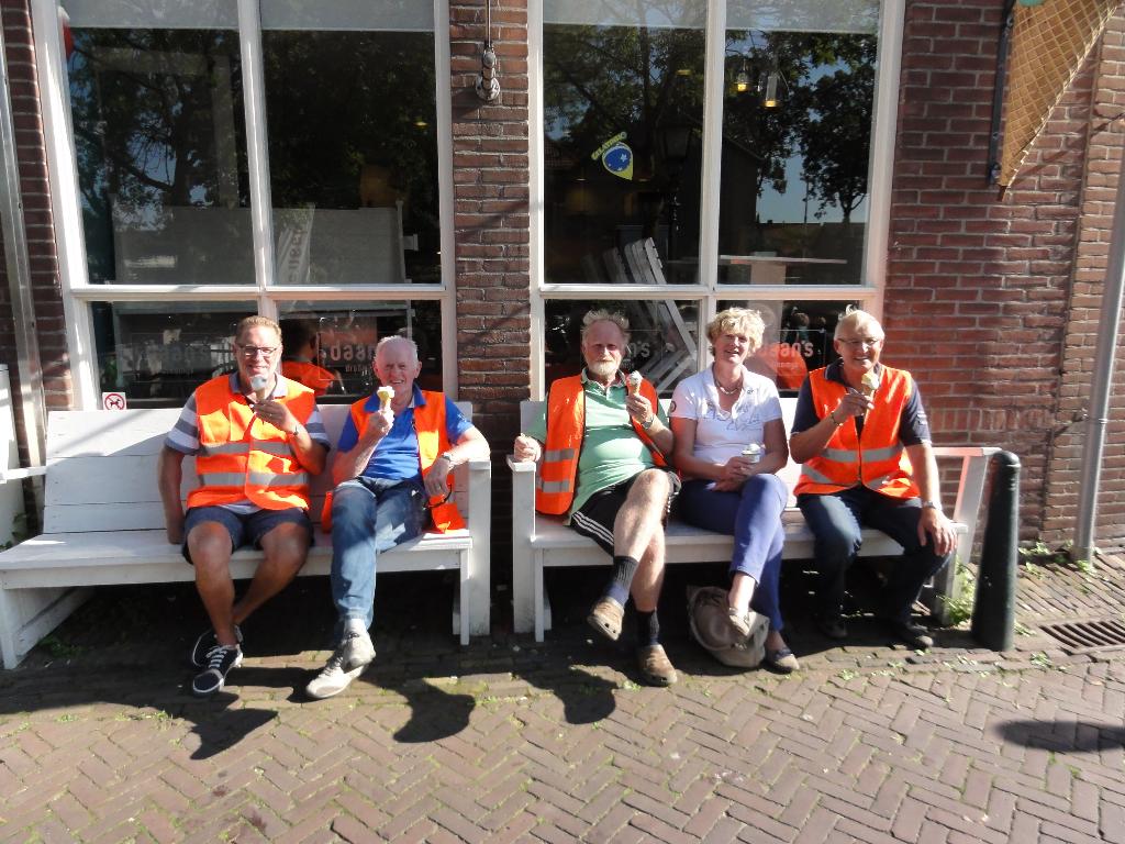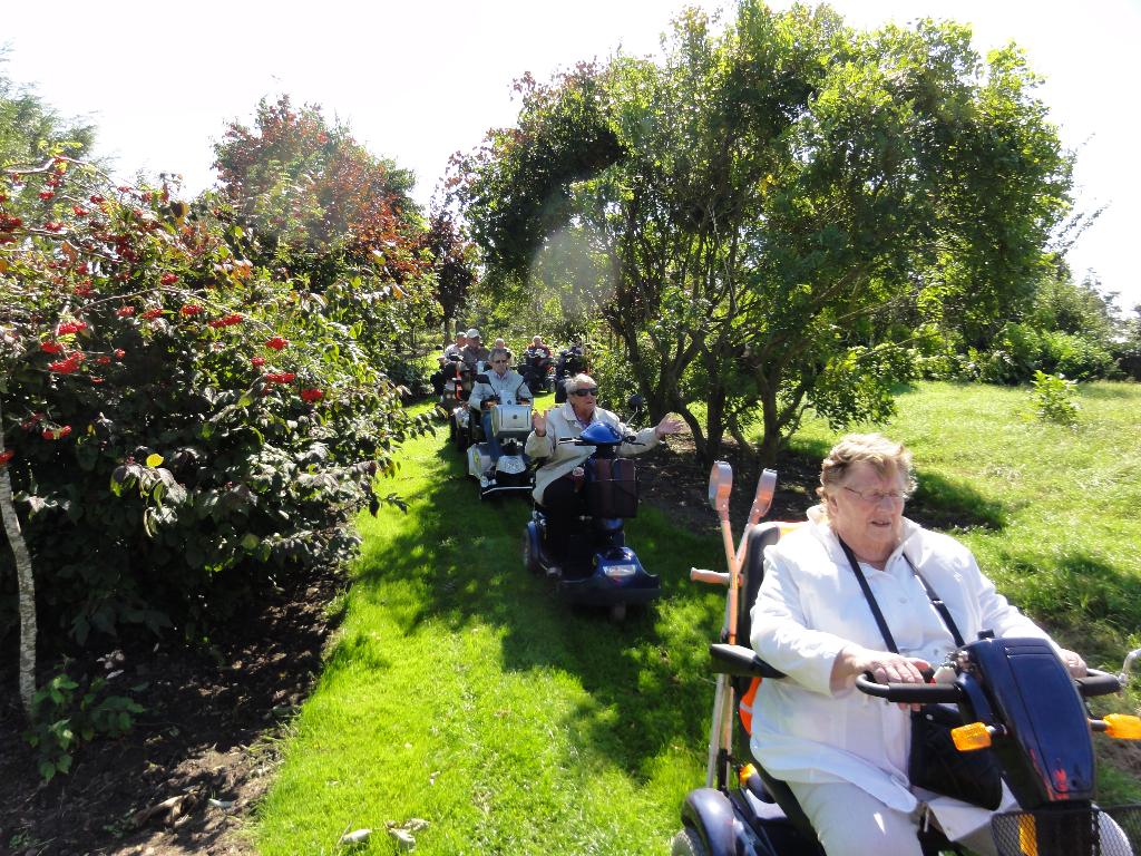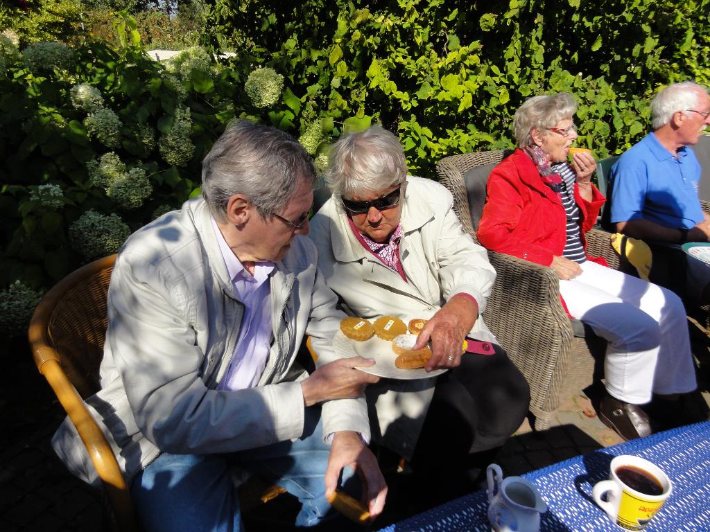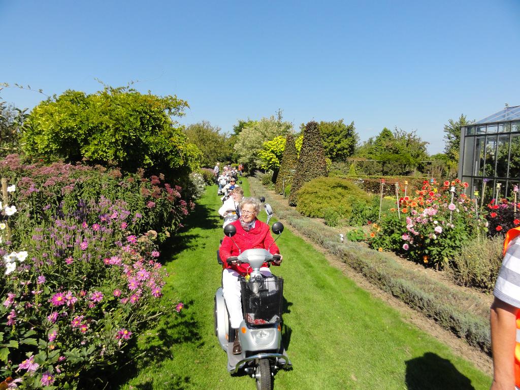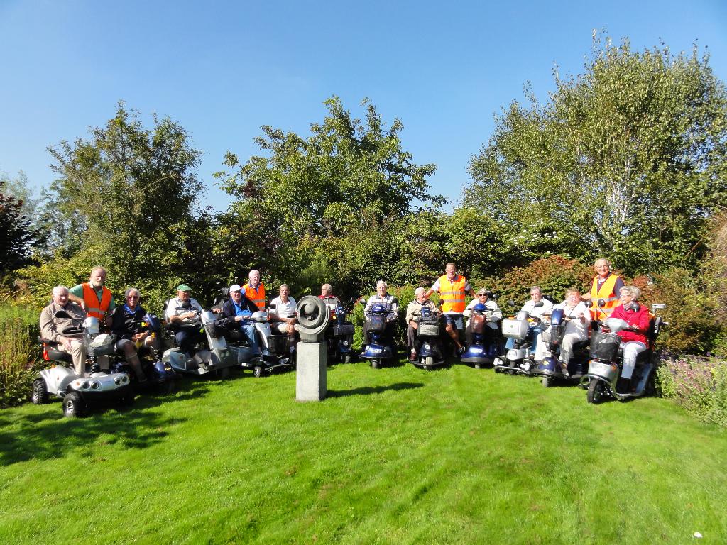 Geplaatst op:05-09-2014 Bijgewerkt op:05-09-2014 17:39 Actieve Scootmobielclub Montfoort weer op padBron: Ton de JongWoensdagmiddag jl reden we met prachtig weer een mooie route door ons mooie landschap op weg naar Theetuin Polderzicht, bij Joke en Aad van den Berg op Achthoven West. We kregen eerst een boeiende rondleiding van Aad door hun grote en werkelijk prachtige tuin. Mooi was te zien hoe de herfst zich al aankondigde. Aad tracteerde ons vervolgens op koffie met gebak wat zeer gewaardeerd werd door onze leden. Op weg naar huis is Bertineke van Dam met ons mee gereden. Ze is onze coördinatrice binnen de SWOM en wilde graag de Scootmobielclub eens in actie zien. De begeleiders zeiden geen nee tegen haar aanbod om bij Daan’s Droomijs een ijsje te gaan eten!! Joke en Aad, namens alle leden en begeleiders hartstikke bedankt voor jullie gastvrijheid, wat hebben we weer genoten van jullie Theetuin Polderzicht!! Begeleiders Ton - Jan - Albert - Ton