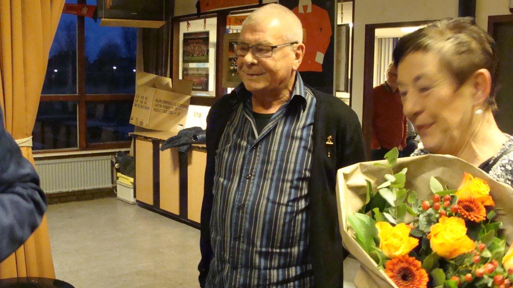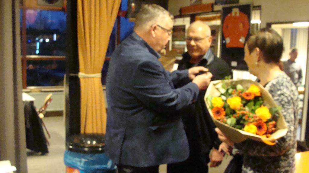 Aan het einde van de Nieuwjaarstoespraak van scheidend voorzitter Dick ten Hoonte werden hem de gouden speld opgedaan , ontving zijn vrouw een mooie bos bloemen en ontving het echtpaar tevens een dinerbon.
