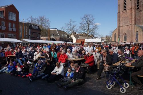 Geplaatst op:20-04-2015 Bijgewerkt op:20-04-2015 17:07 Derde Korenfestival Mantelmeeuw druk bezochtZes zangkoren uit het Groene Hart zongen zaterdag 18 april op een zonovergoten Kerkplein voor honderden toehoorders uit Woerden en wijde omgeving hun mooiste muziek. De koren brachten een uitgebreid repertoire ten gehore, van pop tot levenslied en van licht-klassiek tot gevoelige ballads. Samen gaven ze enthousiast vorm aan het derde Korenfestival, dat Stichting de Mantelmeeuw (hospice en vrijwillige thuiszorg in Woerden) in het kader van haar vijftienjarig bestaan organiseerde. De aanstekelijke muziek inspireerde het publiek tot meedoen. Er werd meegezongen en gedanst, gelachen en af en toe zelfs een traantje van ontroering weggepinkt. Er was kunst (schilderijen en beelden, beschikbaar gesteld door kunstenaars uit Woerden) te koop waarbij de opbrengst van de verkoop geheel ten goede komt aan De Mantelmeeuw, die voor de financiering van haar zorg afhankelijk is van vrijwilligers, donaties en sponsoring. Ook meldden zich bijna 60 mensen aan als nieuwe donateur van de Stichting die in het hospice en met terminale thuiszorg in Woerden mensen in de laatste fase van hun leven ondersteunt. De Mantelmeeuw verwelkomt in het vijftiende jaar van haar bestaan graag de 1500e donateur. De nieuwe aanmeldingen brengen dat streefgetal weer iets meer binnen bereik. Met het Korenfestival, dat werd afgesloten met drie liedjes door de aanwezige koren te samen, vraagt De Mantelmeeuw aandacht voor de wereldwijde hospicebeweging en de vrijwillige palliatieve zorg bij mensen thuis en in het hospice aan de Meeuwenlaan. Het Korenfestival werd gesubsidieerd door het Woerdense bedrijfsleven en een aantal instellingen. In het kader van het vijftienjarig bestaan heeft De Mantelmeeuw in september ook een hele bijzondere open dag op het programma staan. Koren uit de regio zongen voor een groot publiek op het Kerkplein (foto’s: www.HansPieters.nl)