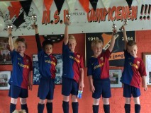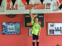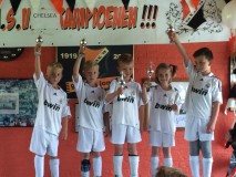 Geplaatst op:31-05-2015 Bijgewerkt op:31-05-2015 18:13 Verslag MSV Champions League finaleBron: Kees BoumanZaterdag 30 mei 13.30uur was het dan eindelijk zo ver, want deze middag worden de MSV Champions League finale wedstrijden gespeeld bij MSV'19 op de velden van sportpark Hofland. Mede door het mooi voetbal weer, liep het sportpark al snel vol met supporters. Chelsea ging als toren hoge favoriet de finale wedstrijd in. De eerste helft had AC Milan het zwaar en stond onder druk. Echter na een 1-0 ruststand voor Chelsea, voetbalde AC Milan zich onder de druk uit en werd zelfs een tijdje de boven liggende partij, wat resulteerde in een 2-1 voorsprong voor het team uit Milan. Gelukkig voor Chelsea herpakte het team zich tijdig en eindigde de wedstrijd in een 2-2, waarna een sudden death / golden goal zou moeten leiden tot een winnaar. De teams streden in de verlenging voor wat ze waard waren, waarbij favoriet Chelsea tenslotte als eerste scoorde en daarmee de cup met de grote oren veroverde. De strijd om de 3 en 4 plek eindigde in een duidelijk overwinning voor Barcelona, welke Inter Milan met 5-2 versloeg. Voor plek 5 en 6 was net als in de finale een verlenging nodig. Naar een 7-7 eindstand, bracht het team van Liverpool na 4 minuten spelen het team Real Madrid de nekslag toe en eindigde de wedstrijd dus in een 8-7 overwinning voor de Reds. Gelijktijdig werden op veld 2 de nieuwe introductie leden ontvangen. Na een warming up, een aantal voetbal oefeningen werd er afgesloten met een partij vorm. Dat ook dit jaar de introductie weer een succes werd, bleek wel, nadat direct na het partijtje voetballen 14 nieuwe leden zich aanmelden als lid.