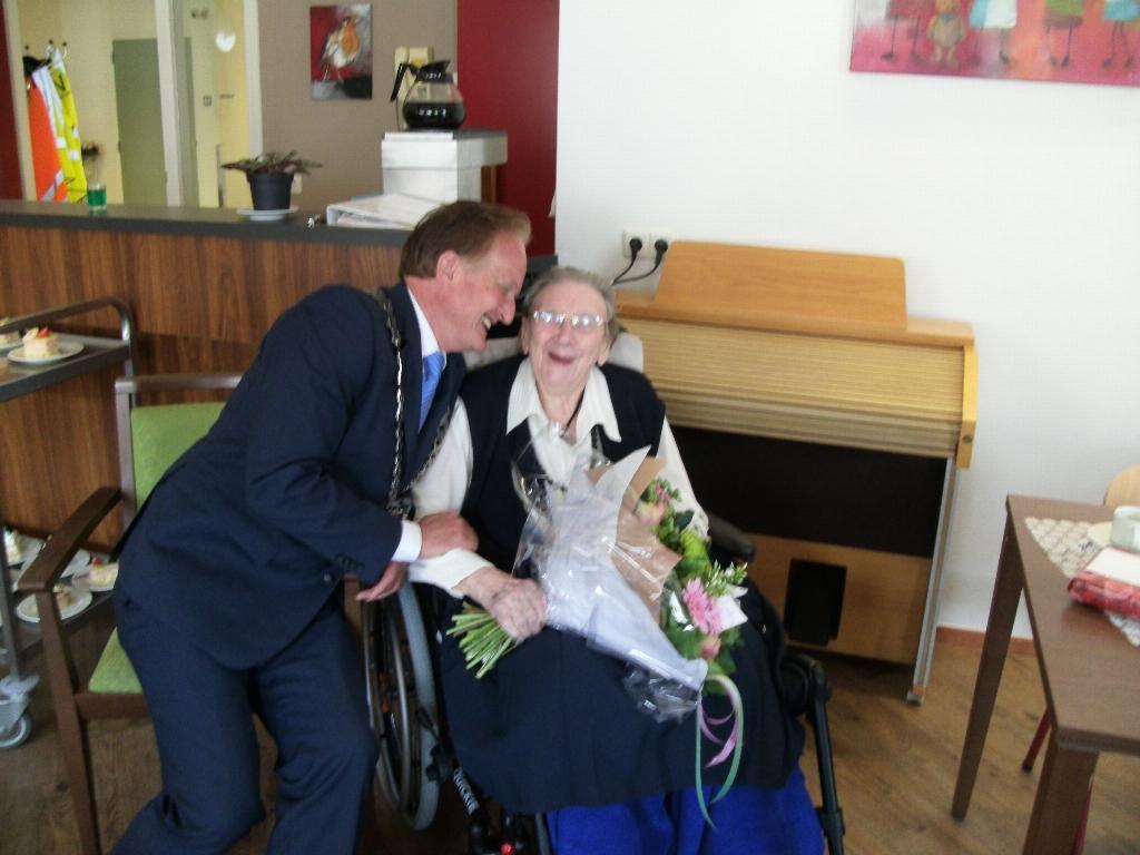 Geplaatst op:05-08-2015 Bijgewerkt op:05-08-2015 11:34 Op bezoek bij de 101- jarige Wil in LinschotenBron: Nettie Kuijer, redactie Radio Stad MontfoortWoensdag 5 augustus stond het gebak weer klaar in de Lindescote. Mevrouw Romijn – De Graaf vierde haar 101e verjaardag! Burgemeester Van Eijk van Montfoort kwam, samen met de pers, haar en haar familie feliciteren. Blozend nam de jarige de bloemen en zoen van de burgemeester in ontvangst. Willemijntje, roepnaam Wil is geboren in Kamerik. Ze werkte als o.a. als tandartsassistente bij tandarts Okker in Woerden en trouwde in 1943 in Stadskanaal. Ondanks dat haar man een vrijstelling had werd hij toch weggevoerd naar Duitsland en bleef ze achter met twee kinderen. Ze verhuisden naar Linschoten waar ze de aannemerszaak overnam. Inclusief alle bouwkundige werk van landgoed Linschoten. De werkplaats was naast hun woning aan de Engerzandweg. Ze ontving iedereen met koffie en de werknemers aten mee aan de keukentafel. In haar gezin, met haar zonen Kees en Piet, heeft ze veel geluk ervaren. Wil heeft een rijk nageslacht van 2 kinderen, 6 kleinkinderen en 22 achterkleinkinderen. Ze is erg betrokken met hen vergeet niet gauw een verjaardag. 14 Foto's bij dit artikel Bekijk alle 14 foto's die bij dit artikel horen: 101 jaar