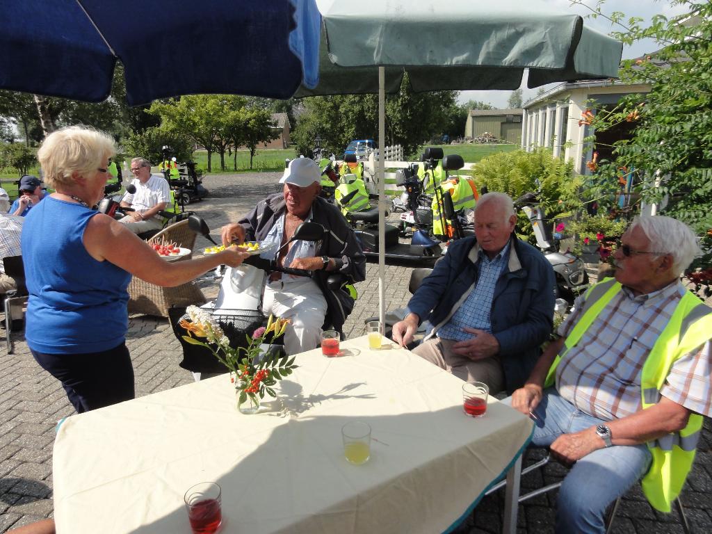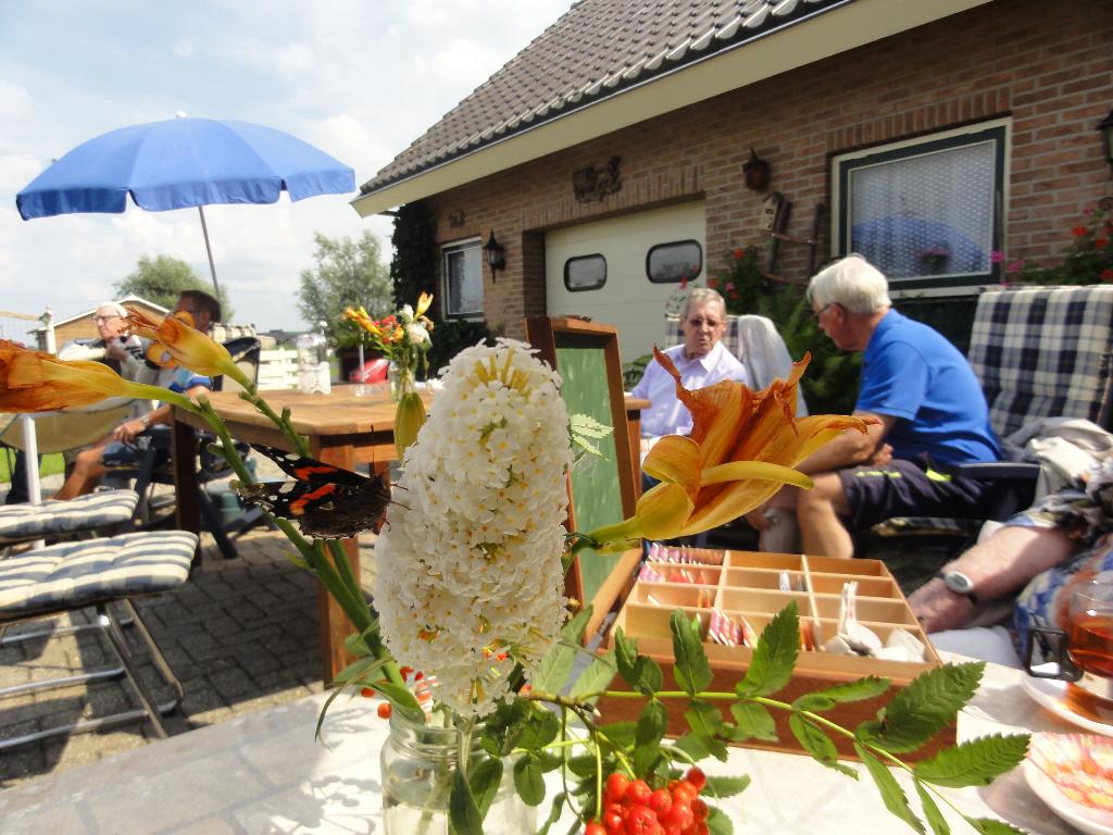 Geplaatst op:22-08-2015 Bijgewerkt op:22-08-2015 07:31 Scootmobielclub op padBron: Tekst Truus, foto's Ton de JongNa alle pech van vorige week was iedereen vandaag weer vol goeie moed om een mooi tochtje te maken op hun scootmobiel. Via IJsselkade naar de Reinaldaweg richting Linschoten. Eenmaal bij het Weidepad bleken er volop wegwerkzaamheden te zijn. Hier is met hulp van alle begeleiders doorheen geworsteld en om 14.30u werden we hartelijk welkom geheten door Gerda en Martien van de Werf in Cattenbroek. Inmiddels al weer enkele jaren worden we hier 1 x per jaar verwend, zo ook nu. De tuin was erg gezellig aangekleed met vlinder vriendelijke plantjes op tafel. De vlinders lieten zich volop zien, waar iedereen van genoot. Gerda en Martien schonken koffie en thee met verse muffins. Gevolgd door heerlijke aardbeien en meloen uit eigen tuin en gevulde eitjes van eigen kippen. Voor we afscheid namen vertelde Gerda nog, het zo leuk te vinden om de mensen nu eens te verwennen waar ze in de Antoniushof zorg aan verleent en waar ze zelf ook vaak koffie van krijgt. Gerda en Martien, namens ons allen, heel hartelijk bedankt voor jullie gastvrijheid!!