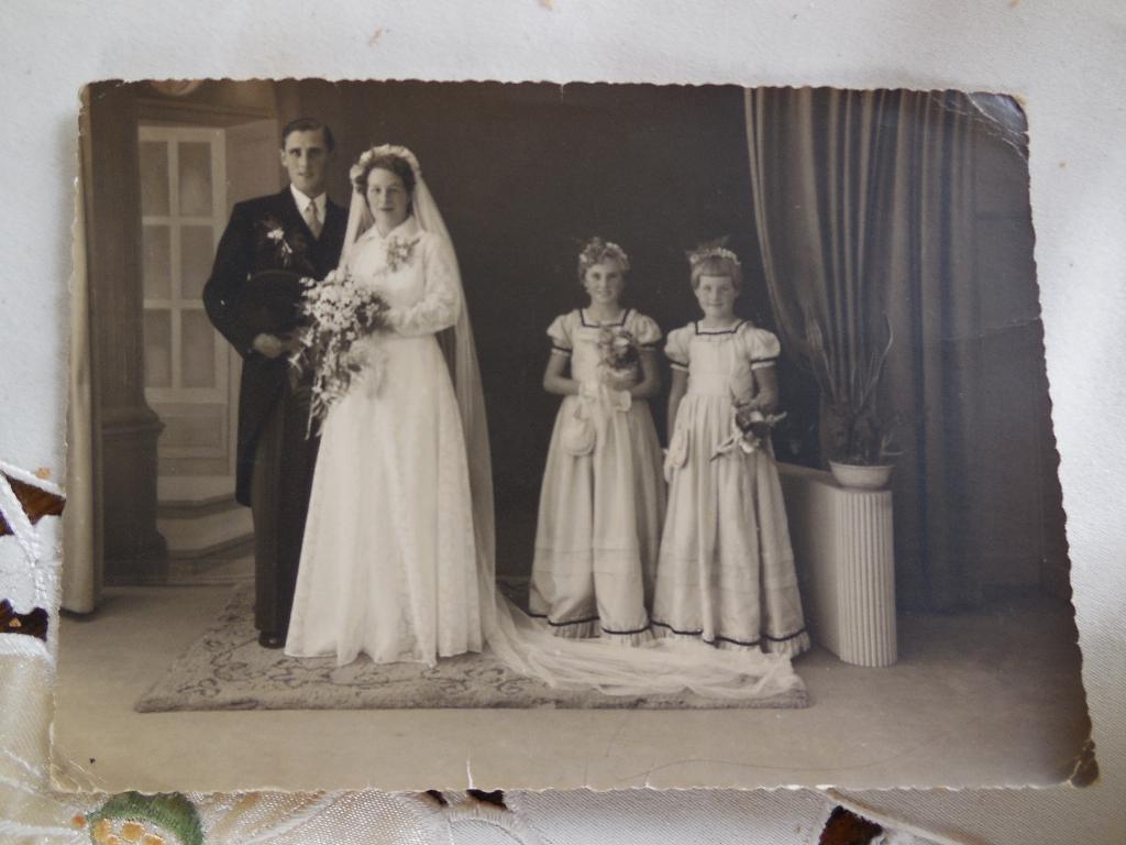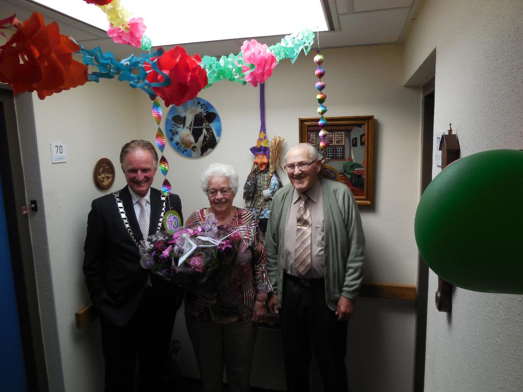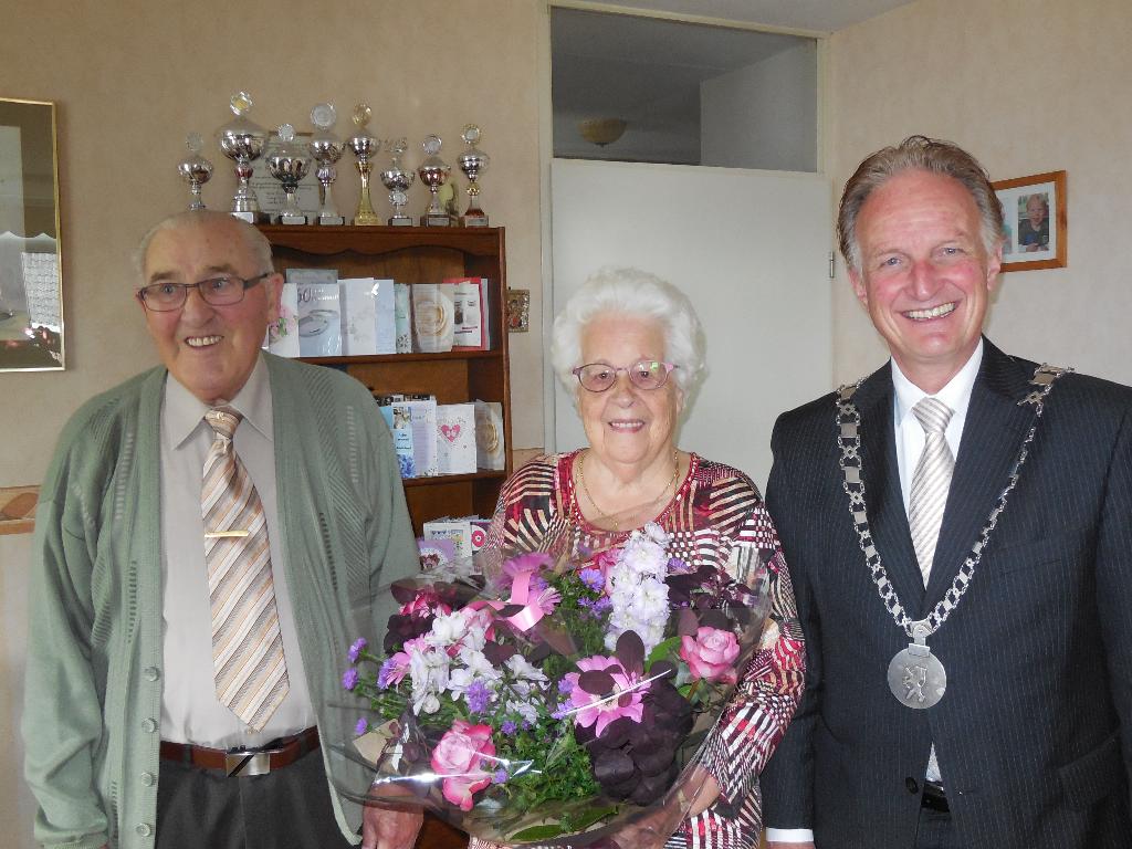 Geplaatst op:20-09-2015 Bijgewerkt op:20-09-2015 14:23 Diamanten bruidspaar Kemp KooijmanBron: redactie RSM Aad van der VeenOp zaterdag 19 september bracht burgemeester Theo van Eijk een bezoek aan het bruidspaar Kemp. Dit ging gepaard met een prachtig boeket bloemen, welke hij namens het gemeentebestuur aan hen overhandigde. Bertus Kemp (85 jaar) en Jeanne Kooijman (86 jaar) zijn geboren en getogen in Montfoort. Alhoewel Bertus eigenlijk in Linschoten is geboren, is hij voor 100% een Montfoortenaar. Jeanne is opgegroeid in de Verlengde Hoogstraat en zij leerden elkaar kennen op de dansles bij Ekelschot. Toentertijd hadden we hier nog een jongens- en een meisjesschool vertelde Jeanne en als je dan met gras onder je schoenen thuis kwam, dan wisten de ouders alweer hoe laat het was. Ze hebben 4 jaar verkering gehad en toen ze trouwden kochten ze samen met 3 broers van Bertus een stukje grond op Willeskop bij halte Groen voor een prijs van F2,00 de m². |  De trouwfoto met de beide bruidsmeisjes, 7 en 14 jaar beiden zusters van het bruidspaar. | Bertus was op dat moment chauffeur bij de SOL (Stichtse Oliën- en Lijnkoeken fabriek in Utrecht en Jeanne werkte in de verpleging in IJsselstein. Al snel kwamen er kinderen, 3 dochters en één zoon, de bij velen in Montfoort en daarbuiten bekende Wilfred van diverse TV programma’s. Daar vader veel van huis was, van s, morgens vroeg tot s, avonds , was het dus Jeanne die voor de kinderen zorgde, maar op een gegeven moment werd dat toch te veel en ging Bertus op zoek naar een andere baan, om vooral in de avonden meer thuis te kunnen zijn. Ze hebben 42 jaar op Willeskop gewoond en zijn toen daar de gelegenheid voor kwam, verhuisd naar het Kasteelplein, waar ze met heel veel plezier, tezamen met alle overige bewoners wonen. Vroeger gingen ze met de kinderen naar Raalte op vakantie, in een huisje van een collega die werkte bij de “samenwerking” oftewel de 4 Gemeenten. Tegenwoordig nemen ze deel aan diverse activiteiten van de SWOM, zoals kaarten en bingoën. Ook staat er op de kast een uitgebreide collectie bekers, die Bertus allemaal gewonnen heeft met jeu-de- boules. Daarnaast gaan ze al 15 jaar met heel veel plezier mee met de jaarlijkse busreis van de SWOM. |  De medebewoners van het Kasteelplein hadden de gang feestelijk versierd | Op 20 september, de officiële trouwdag zullen ze, gezamenlijk met hun 4 kinderen, een is er overgekomen uit Canada en hun 7 kleinkinderen en 2 achterkleinkinderen en de rest van de familie nog een hele gezellige dag hebben, waarin deze mijlpaal uitgebreid gevierd zal worden.