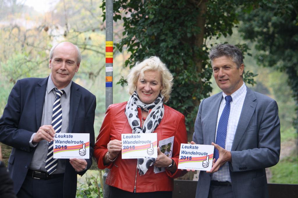 Geplaatst op:29-10-2015 Bijgewerkt op:29-10-2015 14:42 Kromme Rijnpad leukste wandelroute 2015Bron: Recreatie Midden NederlandWoensdagmiddag 28 oktober onthulden de wethouders Kees Geldof van gemeente Utrecht, Rob Zakee van gemeente Bunnik en Wil Kosterman van gemeente Wijk bij Duurstede het bordje Leukste Wandelroute 2015 bij Het Kromme Rijnpad op Amelisweerd. De route kreeg deze zomer circa 40% van de ruim 700 stemmen die werden uitgebracht op www.recreatiemiddennederland.nl. Het Kromme Rijnpad is een bewegwijzerde wandelroute van 29 km die loopt door de gemeenten Utrecht, Bunnik en Wijk bij Duurstede. De route volgt grotendeels de loop van de Kromme Rijn en gaat ook over Amelisweerd. Tijdens de feestelijke onthulling nam wethouder Geldof ons mee terug in de tijd en vertelde over de cultuurhistorische waarden van dit bijzondere gebied en in het bijzonder de Kromme Rijn. Wethouder Zakee benadrukte de economische waarde van Amelisweerd en de verschillende voorzieningen die er voor bezoekers zijn. Tenslotte benaderde wethouder Kosterman de wandelroute vanuit het perspectief van de gebruiker. Een goede route moet volgens wandelaars vooral afwisseling bieden, af en toe een bochtje maken en een horecavoorziening in de buurt is ook belangrijk. Na deze woorden nam de boswachter van Amelisweerd de aanwezigen mee voor een korte wandeling over een deel van het Kromme Rijnpad. De routebeschrijving van het deel van Het Kromme Rijnpad dat over Amelisweerd loopt is verkrijgbaar bij het Bezoekerscentrum. Dit gedeelte van de wandeling is ruim 3 kilometer en zeker ook in de herfst zeer de moeite waard. Kijk voor meer wandelroutes en een routeplanner op www.recreatiemiddennederland.nl.