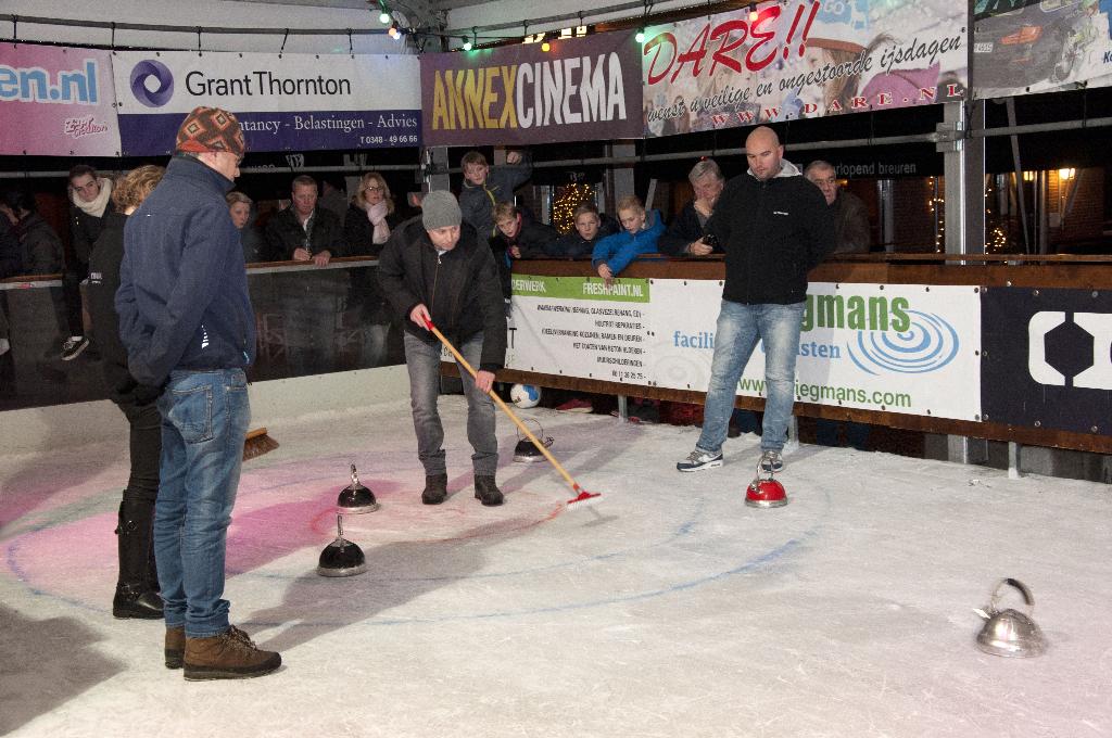 Geplaatst op:24-11-2015 Bijgewerkt op:24-11-2015 08:55 Curlen voor groepjes op Woerdense ijsbaanBron: RPL WoerdenWie wordt dit seizoen Curlingkampioen van Woerden? Als op de Woerdense ijsbaan aan het Kerkplein straks de eerste curlingsteen geworpen wordt, start een competitie die ieder jaar weer op veel enthousiasme mag rekenen. Curling lijkt een beetje op jeu de boules, maar wordt gespeeld met een soort fluitketels. Die glijden – als de curlers het goed doen – doelgericht over het ijs. Tussen het curlen door strijken de spelers neer bij de gezellige koek-en-zopie bij de ijsbaan, waar glühwein en warme chocolademelk staan te dampen. Naast de competitie kan er op drie zaterdagavonden ook ‘vrij’ gecurld worden en zijn er bedrijfsarrangementen. Inschrijven voor eigen curlingwedstrijdje De curlingwedstrijden op de Woerdense ijsbaan zijn buitengewoon populair. Voor de curlingcompetitie stromen de aanmeldingen altijd zo snel binnen dat de competitie al volledig is volgeboekt. Daarom organiseert de ijsbaan ook dit weer avonden waarop ‘vrij’ gecurld kan worden. Op drie zaterdagavonden (5, 12 en 19 december) kunnen groepjes er terecht. Wie met familie, vrienden, kennissen of collega’s in ongedwongen sfeer voor een curlingwedstrijdje het ijs op wil, kan zich aanmelden. Teams kunnen van 18.30 tot 19.30 of van 20.00 tot 21.00 uur voor één uur een of twee banen reserveren. De kosten bedragen 5 euro per persoon. Daarvoor krijgen deelnemers behalve de baan ook een drankje bij de koek-en-zopie van de ijsbaan. Op de website (onder ‘Activiteiten’) is te vinden wanneer er nog plek is. Aanmelden kan via de website of via curling@woerdensewinterweken.nl. Kijken bij curlingcompetitie Wie alleen maar wil kijken naar de voorrondes voor de curlingcompetitie: dat kan ook. De voorrondes zijn tussen 7 en 22 december op diverse doordeweekse dagen. Veel oudgedienden hebben zich al voor de altijd spannende competitie aangemeld, inclusief de winnaar van vorig jaar (het team De Molen Draait Door). De plaatsingsrondes voor de finale zijn op woensdag 23 december en maandag 28 december. Op zaterdag 2 januari vindt de Grande Finale plaats. Er wordt dan gespeeld van 19.30 tot ongeveer 21.00 uur. Veel bedrijven hebben zich dit jaar aangemeld voor eigen curlingwedstrijden. Ze combineren die vaak met een etentje bij Van Rossum, het restaurant waarmee de ijsbaan samenwerkt in interessante arrangementen. Voor bedrijvencurling zijn nog een paar plaatsen beschikbaar. IJsbaan Woerden is een initiatief van de Woerdense Rotaryclubs en Rotaract. Alle activiteiten op de ijsbaan zijn te volgen op de website www.ijsbaanwoerden.nl, via twitter en www.facebook.com/curlingcompetitieijsbaanwoerden Spanning en vooral veel lol tijdens de curlingcompetitie (foto Sylvia van Halm)