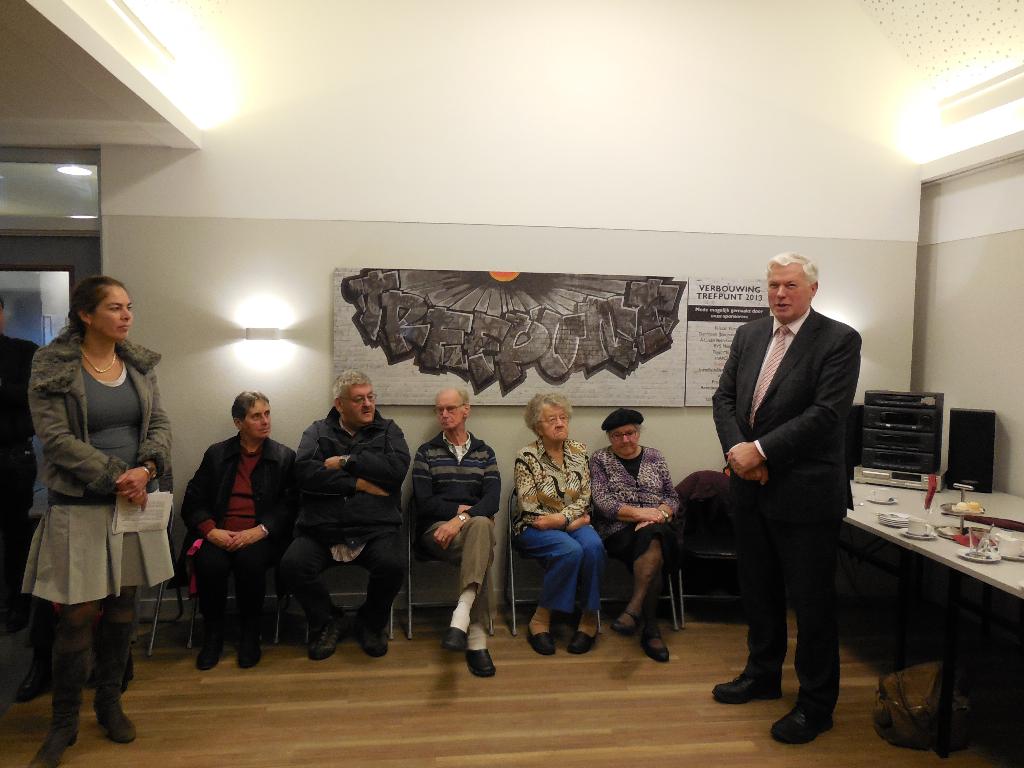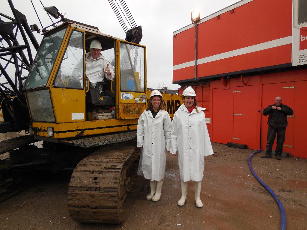 Geplaatst op:24-11-2015 Bijgewerkt op:24-11-2015 15:38 Eerste paal voor nieuw woonzorgcentrum in LinschotenBron: redactie RSM Aad van der VeenIn een storm- en regenachtig Linschoten werd op dinsdag 24 november door wethouder Vlaar de eerste paal geslagen voor dit unieke project. Na vele jaren van voorbereiding sinds 2009 was het eindelijk zover. De bouw van het nieuwe woonzorgcentrum in Linschoten is van start gegaan. Deze feiten werden achtereenvolgens door wethouder Vlaar, mevrouw Verdooren van GroenWest en mevrouw Broex van Welthuis gememoreerd. |  Wethouder Vlaar en Mevr. Verdooren |  Mevr. Broex van Welthuis | Dit onder de belangstelling van een groot aantal toekomstige bewoners. Hiervoor was een binnen locatie gekozen, namelijk het Trefpunt. Dit is aldus de sprekers, het resultaat van de goede samenwerking tussen de gemeente Montfoort, provincie Utrecht, Welthuis en GroenWest. Het woonzorgcentrum biedt plaats aan 33 zorgappartementen en 14 huurappartementen en wordt een prachtige aanvulling op het dorp. Door dit bijzondere woonconcept kunnen mensen langer in hun eigen dorp blijven wonen. Hierna vertrok het gezelschap naar de bouwlocatie, waar door de wethouder onder toeziend oog van de beide dames en alle overige belangstellenden de eerste paal werd geslagen.