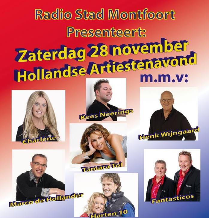 Geplaatst op:01-12-2015 Bijgewerkt op:02-12-2015 22:08 Geweldige Hollandse artiestenavondBron: redactie RSM Aad van der Veen, Edwin Tollenaar en Carla van ZuylenOp zaterdag 28 november organiseerde Radio Stad Montfoort weer een Hollandse Artiestenavond. Het was wederom een avond om niet te vergeten met een groot scala aan Nederlandse artiesten. De zaal was goed gevuld met een publiek wat soms van heinde en verre naar het mooie Montfoort en specifiek de St. Joseph was gekomen om te genieten van alle optredens. De avond werd geopend door de bekende Utrechtse zanger Kees Neerings en onmiddellijk bleek dat de sfeer er goed inzat. Hij sloot zijn optreden af met één van zijn bekendste songs “betoverend”. Hierna kondigde Edwin Tollenaar als presentator en de grote motor achter dit festijn een extra artieste aan en wel Maria Louise uit het verre Groningen. Zij was de zangeres van het bekende “Duo nationaal”, die thans niet meer bestaat. Zij sloot haar optreden af met een Corry Konings medley, die al snel door de gehele zaal werd meegezongen. Hierna volgde het duo “Harten 10”. Bekend van vele optredens op o.a. het piratenfestival en radio. Al snel kwamen de eerste mensen op de vloer om een dansje te wagen. Vooral toen zij afsloten met hun nummer “Dromen. Toen was het de beurt aan de Fantasticos, die een groot aantal bekende en minder bekende nummers ten gehore brachten. Het leverde in ieder geval op dat moment een volle dansvloer op en steeds meer publiek waagde een dansje op hun bekende nummers Bahia Blanca en “weet je wat jij voor mij bent”. Charlène een ras artieste uit Tilburg en een echte zangeres van het levenslied. Zij gaf de zaal even de gelegenheid om bij te komen van alle inspanningen op de dansvloer. Zij zong o.a. een van haar laatste hits “ik heb geen woorden nodig”. Toen was de Volendamse lieveling Tamara Tol aan de beurt. Zij zong een liedje wat binnenkort verschijnt en wel op 10 januari. Bekend van zowel optredens bij de Toppers als het Nederlandse songfestival, bracht zij veel van haar bekende hits. De nieuwe single “He schatje He” was te horen, maar ook haar nummer “Kom hou van mij”. Na haar optreden was het druk met fans achter de coulissen, die allemaal een handtekening wilden en met haar op de foto gingen. Hierna was het dan de beurt aan de bekendste trucker van Nederland Henk Wijngaard. Hij speelde de zaal achter elkaar helemaal plat met heel veel van zijn bekende nummers, die iedereen naast het lopen van de polonaise uit volle borst mee zong. Henk, die vele bekende artiesten achter zich laat op de hitlijsten, kreeg dan ook na afloop heel veel applaus. Het was al rond de klok van 12 uur dat het dak van de St. Joseph er bijna geheel vanaf ging. Nu was het de beurt aan de huisartiest van radio stad Montfoort Marco de Hollander. Hij meldde al vooraf, dat hij wel 30 verzoekjes had gekregen, maar dat iedereen dan wel de volgende morgen naar huis kon. Daarom beperkte hij zijn veelzijdige repertoire tot 10 nummers. Het eerste nummer wat hij zong, was op verzoek van een van de trouwste Montfoortse fans en wel het nummer “Mijn grote kameraad”. Hierna volgden nog vele nummers o.a. van zijn nieuwe cd “Lachend door het leven”. De avond werd afgesloten met een loterij, met dank aan de vele sponsors voor het wederom mogelijk maken van deze geweldige happening, waarna iedereen rond de klok van 01.00 uur meer dan tevreden huiswaarts kon keren. kijk vooral in ons fotoboek voor alle overige foto’s, en zet 26 november 2016 maar vast in je agenda !