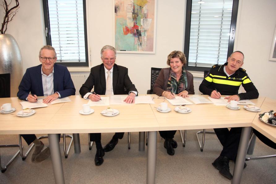 Geplaatst op:21-12-2015 Bijgewerkt op:21-12-2015 20:39 Montfoort start buurtbemiddeling voor 2016 en 2017Bron: gemeente MontfoortOp 18 december hebben gemeente Montfoort, woningcorporatie GroenWest, politie en SWOM de handen ineen geslagen en besloten te zorgen voor een gecertificeerde buurtbemiddeling in Montfoort. De samenwerkingsovereenkomst voor 2016 en 2017 werd getekend door burgemeester Theo van Eijk, Rob Meijrink, manager wonen en vastgoed van woningcorporatie GroenWest, Bert Roemeling, Teamchef basisteam De Copen van Politie Midden-Nederland en Jany van Dijk, directeur-bestuurder van Stichting Welzijn Ondersteuning in Montfoort en Linschoten (SWOM). |  Foto: Paul van den Dungen |