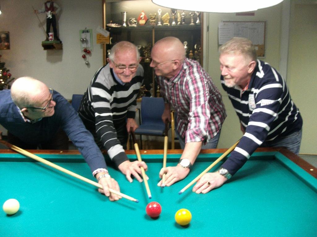 Geplaatst op:04-01-2016 Bijgewerkt op:05-01-2016 11:22 Unieke biljartfamilie bij Kasteelzicht in MontfoortBron: Nettie Kuijer, redactie Radio Stad MontfoortBiljartvereniging Kasteelzicht in Montfoort is een bloeiende gezellige vereniging met 98 competitiespelers. “Kunnen biljarten is geen pré,” wordt er vaak lachend gezegd. Familiebanden worden aangehaald rondom het biljart. Een van de regels van de vereniging is dat leden van het mannelijke geslacht moeten zijn, en in het jaar dat ze lid worden 60 jaar of ouder zijn. Dat Vader en (schoon)zonen elkaar treffen in de zaal is dan ook uniek. Albert Scheel, voortreffelijk speler in poule A, heeft zijn zoon Jaap en schoonzonen Toon Haselkamp en Arnold Achterberg echter weten te inspireren.