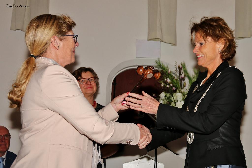 Geplaatst op:07-01-2016 Bijgewerkt op:07-01-2016 18:24 Installatie Burgemeester Van HartskampBron: gemeente Montfoort Fotografie: Jos SangersOp 6 januari is mr. P.J. (Petra) van Hartskamp-de Jong geïnstalleerd als burgemeester van Montfoort. Tijdens haar installatie benadrukte burgemeester Van Hartskamp dat het vele water, de natuur en historie Montfoort en Linschoten zo aantrekkelijk maken om in te wonen en te werken en voor haar persoonlijk belangrijk zijn. Van Hartskamp ziet uit naar de ontmoeting met de mensen die Montfoort maken. Zij gaat graag in gesprek met inwoners, vrijwilligers, ondernemers en bestuurders om te horen wat zij vanuit hun rol belangrijk vinden. “Met u wil ik ontdekken wat de verhalen zijn van Montfoort en Linschoten en wat het gezamenlijke verhaal zou kunnen zijn van raad, college, inwoners en ondernemers. Antwoord geven op de vraag hoe wij Montfoort verder op de kaart kunnen zetten.” Van Hartskamp staat een daadkrachtig gemeentebestuur voor: “Het is belangrijk om als gemeentebestuur eenheid uit te stralen, een duidelijke koers te varen en vooral goed hierover te communiceren”. Ook gaat de nieuwe burgemeester in nauw contact met Raad en college de banden met de regiogemeenten en andere ketenpartners verder verstevigen, en verkennen waar verdere samenwerking een meerwaarde kan opleveren. Locoburgemeester Jan Vlaar mocht Van Hartskamp de ambtsketen omhangen. In zijn speech benadrukte hij de zorgvuldigheid van de selectie. “De Commissaris van de Koning heeft samen met de Raad een stabiele bestuurlijke setting gecreëerd, waarin burgemeester Van Hartskamp geworven en benoemd kon worden. Een stabiel bestuur, een stabiele raad,” aldus Vlaar. Ook bedankte hij waarnemend burgemeester Theo van Eijk voor zijn inzet en onvermoeibare werklust. Vlaar vergeleek hem met een broer van voetballer Dirk Kuijt: “Hij neemt ook het gehele team mee, je kunt hem op alle posities inzetten, hij weet zelf scoringskansen te creëren maar heeft er ook veel plezier in om zijn medespelers te laten scoren en voorzetten van zijn teamleden te verzilveren.” |  De voorzittershamer werd overhandigd door Mevr, Driesse |