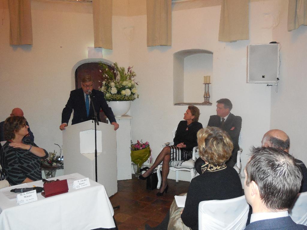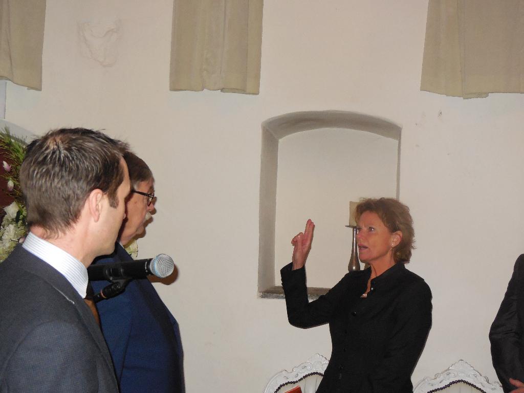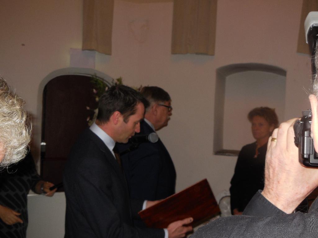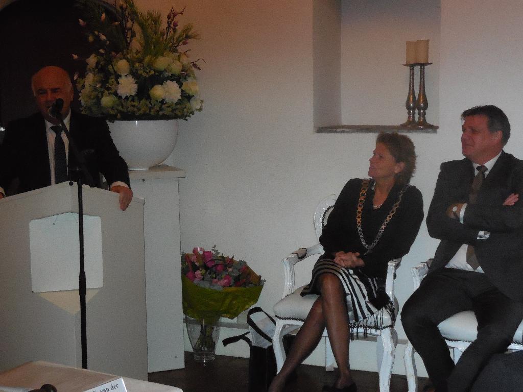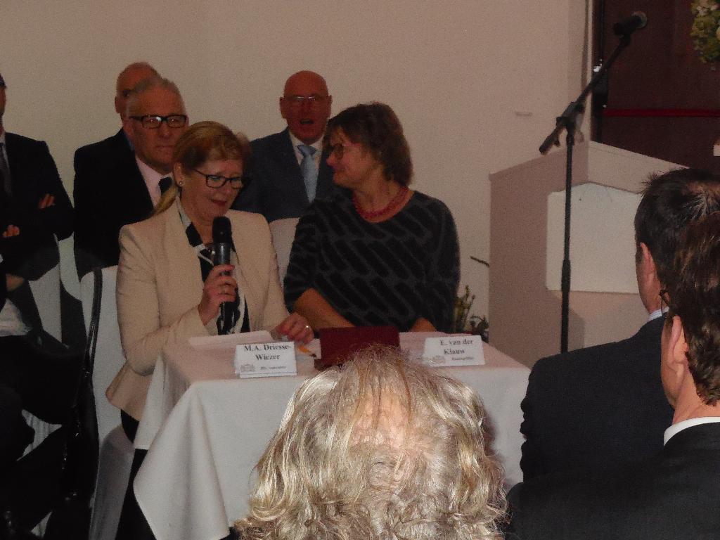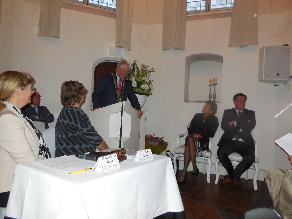 Mevr. Driesse opende de vergadering met een welkom aan alle genodigden, waaronder in het bijzonder Petra en haar man, dochter en schoonmoeder. Haar zoon was op dat moment in het buitenland en dus niet aanwezig. Zij schetste de bijzondere locatie waar dit gebeurde en daarnaast had zij nog een woord van dank voor Theo van Eijk die vanaf vandaag zijn interim burgemeesterschap heeft beëindigd.