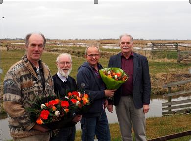Geplaatst op:21-03-2016 Bijgewerkt op:21-03-2016 12:50 Stichting reikt prijzen fotowedstrijd uitBron: Bernt Feis, projectdirecteur Afgelopen zaterdag werd de uitslag bekend van de fotowedstrijd Levende natuur in het Groene hart, die de Stichting Groene hart heeft georganiseerd. In het pas geopende Groene Hart Atelier met uitzicht op natuurgebied Ruygeborg, overhandigde directeur Sjoerd Veerman de prijzen. Uit 150 inzendingen koos de jury drie prijswinnaars. Veel foto’s waren al eerder gepubliceerd in het AD Groene Hart. De eerste prijs van € 250 was voor de Montfoortse fotograaf Johan Hanko met zijn ontroerende foto van zwarte stern-kuikentjes op het nest; helaas heeft het linkse kuikentje de kou niet overleefd. De tweede prijs won Dammis van ‘t Zelfde voor zijn prachtige zwanenfoto. En de derde prijs – een slagenlandschap met overvliegende vogels - was voor Abe Maaijen.  | Abe Maaijen, Dammis van ’t Zelfde, Johan Hanko en directeur Sjoerd Veerman, op de achtergrond natuurgebied de Ruygeborg. |