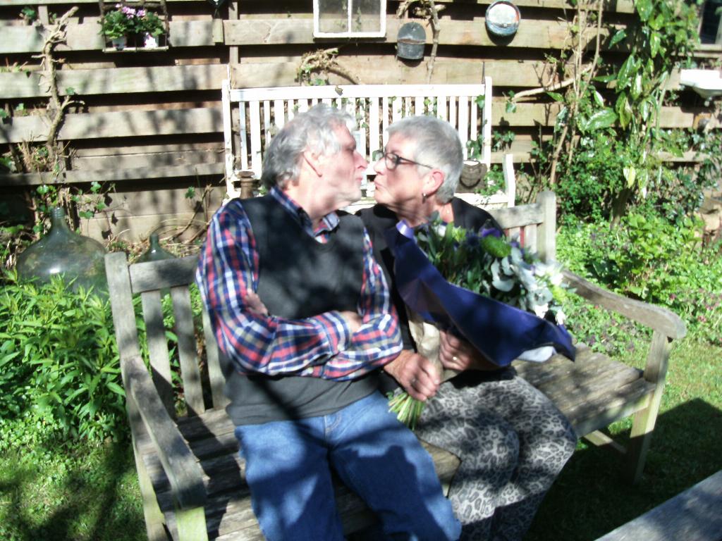 Geplaatst op:20-04-2016 Bijgewerkt op:20-04-2016 17:03 Bruidegom zat op het dakBron: Nettie Kuijer, redactie RSMWoensdag 20 april waren Jacques Remmerswaal en Annie Remmerswaal van Koert 50 jaar getrouwd. Burgemeester Van Hartskamp en de pers gingen het gouden bruidspaar feliciteren. Echter, er werd opengedaan door een hoogst verbaasde bruid. “Mijn man zit op het dak bij onze zoon, om een schotel te installeren. Wij vonden bezoek niet nodig.. Dochter Josje had hen een verrassing bereid. Lachend kwam ze aanrijden en een golf vrolijke mensen stroomde het huis binnen. Stoelen werden aangeschoven en Annie dook de keuken in om koffie en thee te zetten. Josje kwam snel helpen en er werd met spanning gewacht op de bruidegom. Jacques liep even later verbaast binnen en liet zich lachend interviewen en fotograferen.