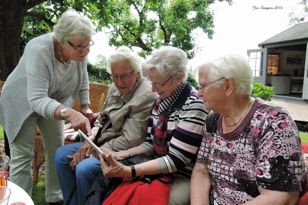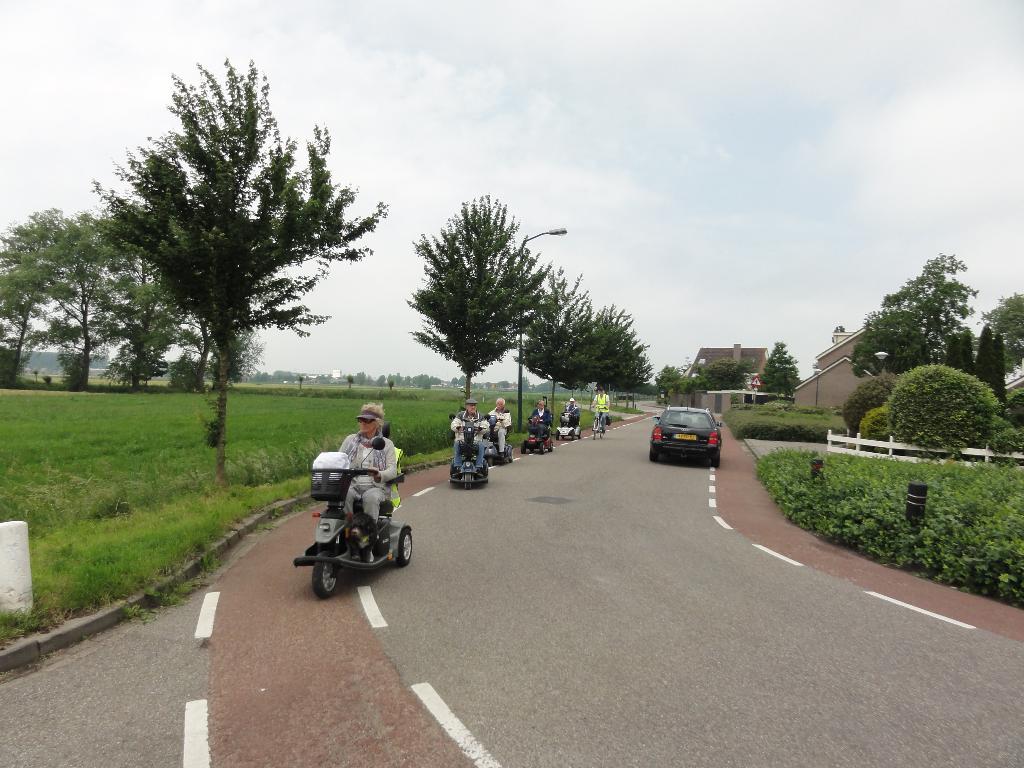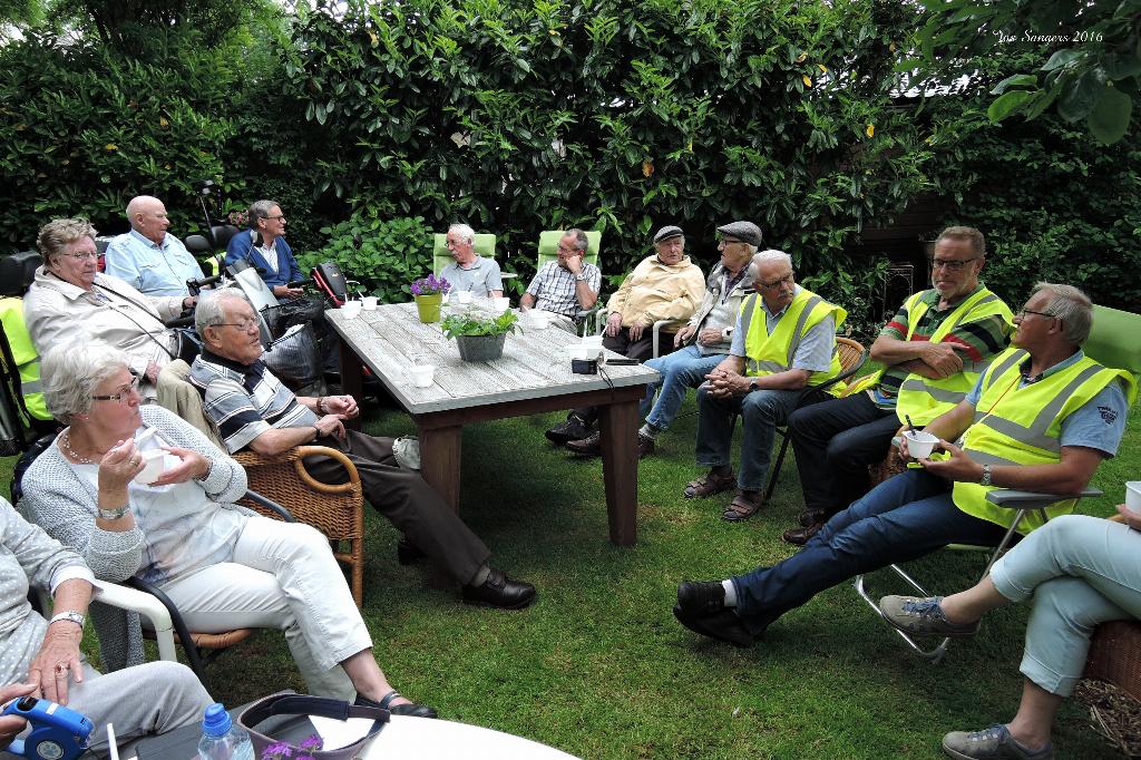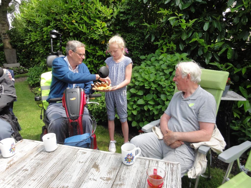 Geplaatst op:02-06-2016 Bijgewerkt op:02-06-2016 19:40 Scootmobielclub 22 meiBron: Tekst: Truus de Jong / Foto�s: Ton de Jong en Jos Sangers Oh, oh wat was het spannend voor de leden van onze Scootmobielclub. Zou onze middag wel doorgaan? Na alle regen van vorige dagen? Ton de Jong, als coördinator, hakte pas om 12.30uur de knoop door en nam daarmee het risico dat we toch op een buitje getrakteerd konden worden. Met dank aan alle weergoden hebben we een geweldige middag gehad.  |  | Via de Benedenkerkweg reden we Blokland in. De Stuivenbergweg bracht ons naar de Achtersloot waar Tineke en Wout van der Horst ons met open armen verwelkomden! Vriendinnen Magda en Joke hielpen Tineke met verse koffie en lekkere koeken serveren, ook hun kleindochter Guusje liet zich niet onbetuigd met haar hulp! In hun super gezellige tuin met weids uitzicht, was het weer als vanouds gezellig vertoeven. Na de koffie kwam voor iedereen, als extra verrassing, nog ijs met verse aardbeien en slagroom op tafel. Iedereen genoot volop totdat het moment van afscheid nemen aanbrak. Zonder een druppel regen hebben we genoten van het rijden door ons mooie Groene Hart-landschap waar nu de natuur op zijn mooist is. Tineke en Wout, namens onze leden en begeleiders Jos-Jan-Rinus-Albert en Ton, heel hartelijk dank voor jullie gastvrije ontvangst van onze club!!