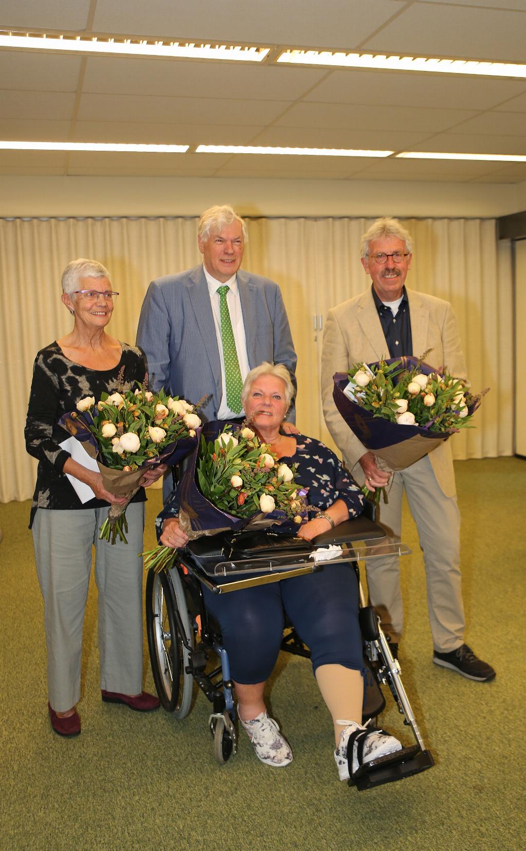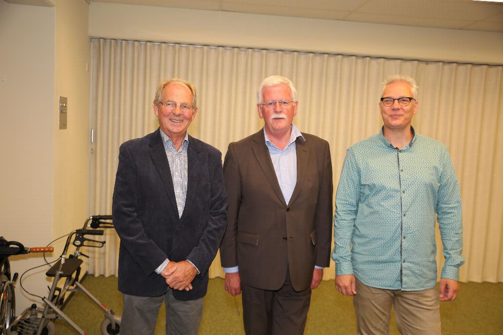 Op donderdag 30 juni 2016 namen het Gemeentebestuur en de medewerkers van SWOM, afscheid van dit bestuur en maakten tevens kennis met de leden van het nieuwe bestuur. Dat deden ze met een afscheidsbijeenkomst in het “SWOM DoeMeeHuis” onder het stadskantoor in Montfoort. De wethouder met de portefeuille o.a. zorg en ondersteuning, welzijn en volksgezondheid, de heer Jan Vlaar sprak de scheidende bestuursleden toe en bedankten hen voor hun inzet en flexibiliteit in de afgelopen jaren. Het gaat om de volgende inwoners van de gemeente Montfoort: Mevr. M.C.A. van der Linden - voorzitter Mevr. A. Hoogendoorn - secretaris Mevr. S. Ponsioen - lid De heer W. van Bodegom - lid De heer T. van der Made - lid De nieuwe bestuursleden van SWOM zijn: Dhr. J.W. Verkroost - voorzitter Dhr. A Hummel - financiële zaken (was ook bestuurslid binnen het oude bestuur) Dhr. D. Veldman - personele -en algemene zaken De heer Felix Touboul is per 1 april jl. de nieuwe directeur van SWOM. Het nieuwe bestuur neemt per 1 juli jl. de taken over. Zij worden op 4 juli 2016 voorgesteld aan de Gemeenteraad. Het nieuwe bestuur zal zich vooral richten op vele preventieve activiteiten binnen het sociale domein voor de inwoners in Montfoort en Linschoten. Aftredend bestuur (links Greet van der Linden, midden Sanneke Ponsioen, rechts Ton van der Made, in het midden de heer J. Vlaar). Niet op de foto: Anita Hoogendoorn en Wim van Bodegom | Nieuw bestuur (links Dries Veldman, midden Jaap Verkroost, rechts Bert Hummel). |