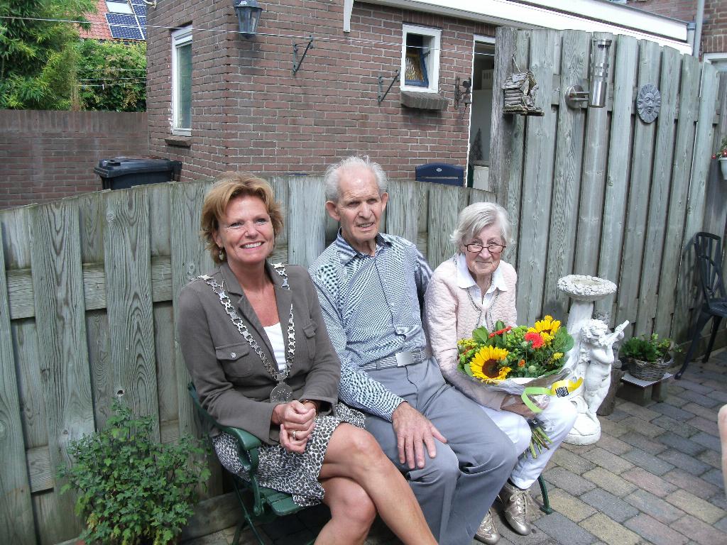 Geplaatst op:08-08-2016 Bijgewerkt op:08-08-2016 14:31 Corrie en Jan: 60 jaar getrouwdBron: Nettie Kuier, redactie Radio Stad MontfoortHet huisje aan de Wilhelminastraat in Montfoort stond 8 augustus vol met bloemen die Corrie en Jan van Leur, het diamanten bruidspaar, hadden gekregen. 7 augustus waren zij 60 jaar getrouwd voor de wet, en dat moest gevierd worden. Ook burgemeester Petra van Hartskamp bracht, samen met de pers, een bezoekje. Er ontspon zich een gezellig gesprek waarin Jan en Corrie verhaalden over vroeger. Jan komt uit Heteren, in Gelderland, uit een groot gezin met 17 kinderen. Al op jonge leeftijd, hij was pas 12 jaar, verloor hij zijn vader. “Mensen klagen tegenwoordig zo gauw,” vertelde Jan. “Maar mijn moeder moest de eindjes aan elkaar knopen met haar grote gezin. Een uitkering bestond nog niet. We sliepen met z’n allen op strozakken op zolder en leefden van giften van de kerk, familie en vrienden.” Corrie van Leur van den Haselkamp komt uit Montfoort. Ze werkte in de wasserij en later op een lingerieatelier. Op de vraag of ze ook voor de kinderen kleding naaide antwoordde ze alert; “Nu niet meer, ik kijk wel uit!” Het stel leerde elkaar kennen doordat Jan, na een operatie in het Diaconessen ziekenhuis, moest revalideren bij zijn moeder op Willeskop. Corrie was bevriend met een broer van Jan en kwam daar regelmatig over huis. De vonk sloeg over en na 1 ½ jaar trouwden zij in Montfoort.  Jan en Corrie |  Corrie (rechts) met haar zussen | Ze woonden op de “Kippenkaai” (Doeldijk) en verhuisden na de brand naar de Wilhelminastraat, waar Corrie nooit meer weg wil. Al kocht Jan een mooi huis aan de Molenstraat, ze gingen er niet heen en hij moest van de koop af zien te komen.Het paar heeft 7 kinderen gekregen, 6 jongens, 1 meisje. Corrie had daar de handen aan vol. Toch maakte 14 jaar lang de tijd om te gaan line dansen. Jan heeft jaren in de steenfabriek gewerkt, daarna als vrachtwagenchauffeur en later als buschauffeur. 70 keer doneerde Jan bloed bij de bloedbank, waarvoor hij werd onderscheiden. Jan is nu mantelzorger voor zijn vrouw en kookt graag een karbonaadje. Corrie gaat nu twee dagen in de week naar de dagbesteding het " het Boerenleven" waar ze het erg naar de zin heeft, vooral de dieren vind ze erg leuk!! De herten en honden, en koeien, ze was altijd een buitenmens veel met de bloemen en tuin bezig. 12 Foto's bij dit artikel Bekijk alle 12 foto's die bij dit artikel horen: Leur