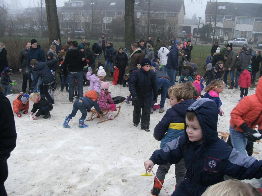 Op de laatste dag van het jaar, zaterdag 31 december, was het ruim 2 graden boven 0. Op het groene gras werden rijplaten gelegd door ALB Looman. Jeroen Kuyf reed met zijn grote truck voorzichtig de vrachtlading sneeuw naar de bestemming. Ongeduldige kinderen stroomden toe met hun inderhaast uit schuren en van zolders gehaalde sleeën. Onder een partytent werden tafels geplaatst van STAM. Er waren kleuters die nog nooit sneeuw hadden gezien of gevoeld. “Au, koud!” klonk dan ook een klein stemmetje. Dankzij het haardhout van Jasper de Jong stond er echter een warme vuurkorf, er was warme chocolademelk te koop en een door Frans van Lint gesponsord appeltje. Geweldig! 16 Foto's bij dit artikel Bekijk alle 16 foto's die bij dit artikel horen: sneeuw