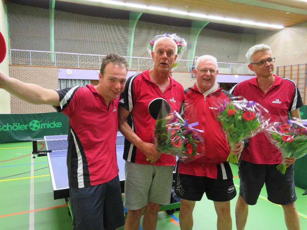 Geplaatst op:19-04-2017 Bijgewerkt op:19-04-2017 19:12 Tafeltennis kampioenen!Bron: Brigit Kers (PR TTV De Schans)In de voorjaarscompetitie 2017 werd team 2 Kampioen. Donderdag 13 april werden zij door de voorzitter Johan de Jong gehuldigd. Gefeliciteerd Jan, Ad, Henny en Ewald!