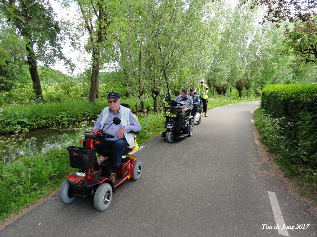 Geplaatst op:18-05-2017 Bijgewerkt op:18-05-2017 09:07 Start Scootmobielseizoen MontfoortBron: Truus de Jong / Foto�s: Ton de Jong en Ton de KlaverWe hebben er lang op moeten wachten maar nu kon het geen beter weer zijn voor de start van ons scootmobielseizoen! Talloze keren hoorden we onderweg van de deelnemers de ahh en ohh’s over de mooie natuur. De fris groene blaadjes en ook hier en daar nog bloesem aan de bomen zorgden dat ze intens genoten van de rit door de Waardsedijk. In Oudewater werd afgeslagen naar de smalle kant van de Noord-Linschoterzandweg om op uitnodiging van Elske, eigenaresse van Theetuin De Kwakel, te gaan genieten van een kopje heerlijke verse koffie met een XXXXL-stuk eigengemaakt gebak naar keuze!! Daarna ook nog een heerlijk koele frisdrank. Super!! Wat waren we weer welkom! Dank aan Elske en haar moeder die ons ook dit jaar weer zo hartelijk verwelkomden!! Dank ook aan alle medewerkers die, ondanks de grote drukte, zo vriendelijk en behulpzaam waren voor onze deelnemers. Na overduidelijke dank van onze leden, uiteraard ook gedeeld door de begeleiders Ton–Rinus–Albert en Ton vervolgden we onze rit terug naar Montfoort. 6 Foto's bij dit artikel Bekijk alle 6 foto's die bij dit artikel horen: scoot mei 1