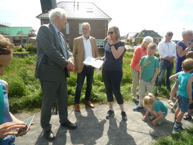 Voor die bijeenkomst waren alle schoolkinderen uitgenodigd en verscheen schaapherder Huug Hagoort met een kleine kudde pas geschoren schapen en een hond. De schapen waren vanwege hun recente ervaring met het scheren wat schrikkerig, maar Huug en zijn hond hadden ze prima in bedwang. Onder het toeziend oog van de schapen werd het plan “Linschoten natuurlijk’ door één van de initiatiefneemsters uitgereikt aan wethouder Vlaar. De eerste actie is een wedstrijd zonnebloemen kweken. Alle aanwezige kinderen kregen een zakje met zaad en straks, aan het eind van de zomer, wint de hoogste zonnebloem een prijsje van Libel.