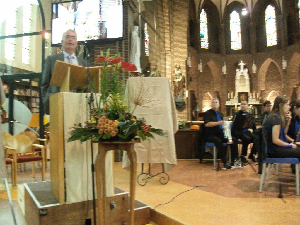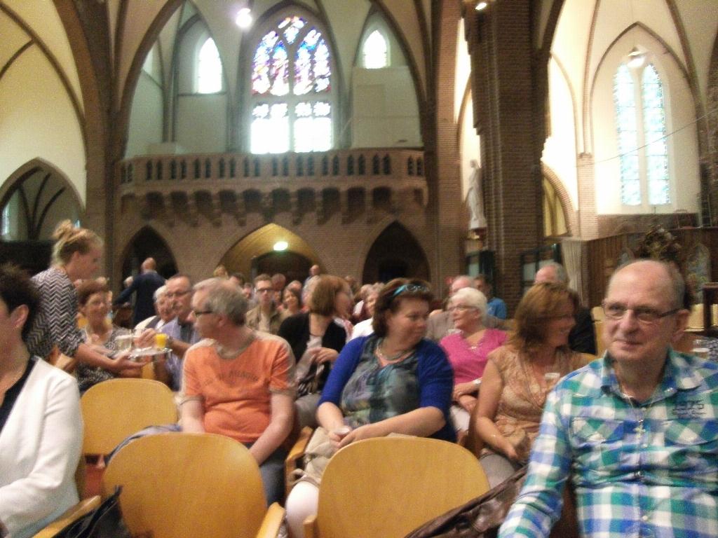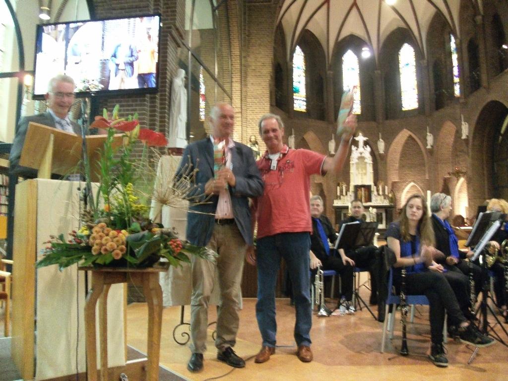 Geplaatst op:24-06-2017 Bijgewerkt op:24-06-2017 12:12 Feest in de Johannes de Doperkerk in MontfoortBron: Nettie kuijer, redactie Radio Stad MontfoortHet was zaterdag 24 juni, op het patroonsfeest van Johannes de Doper, een prachtige dag om de afsluiting van de restauratie te vieren. Muziekvereniging Sint Carolus gaf een concert in de akoestisch perfecte kerk waarna Ad Vendrig, Mariëtte Pennarts en pastor Hans Oldenhof een korte toespraak hielden.  |  |  Een toast op de voltooise restauratie | “Pak de muur eens vast,” zei de pastor, dan voelt u gevoelens met een lach en een traan.” Mariëtte en Ad noemden het Parelfonds, dat door hun enorme bijdrage van €400.000,- een stimulans gaf en andere sponsors over de drempel hielp. Het waren ongelofelijke financiële inspanningen, de acties, creatief en succesvol, zoals het spaarkerkje. De première van de spectaculaire dronefilm van drie minuten rondom en in de kerk werd met plezier en bewondering bekeken. Carolus sloot luisterrijk af, waarna de aanwezigen toasten op het resultaat.  Dakpannen liggen er weer helder bij |