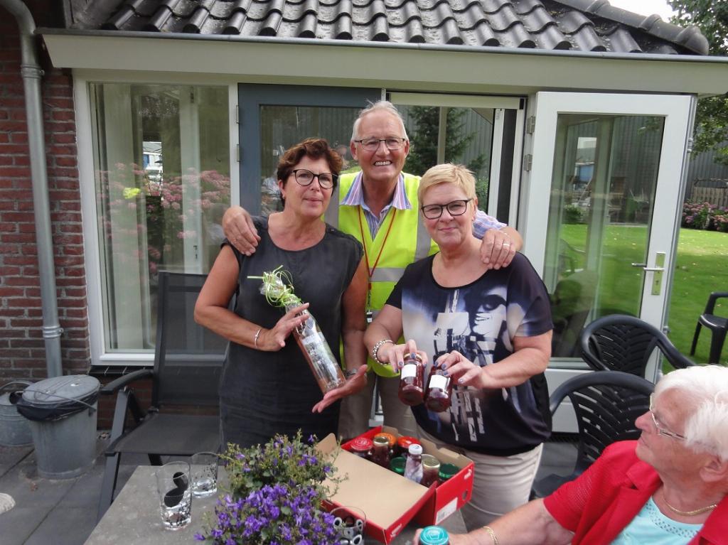 Even later werden we door Sjanie van Dam en haar vriendin Margriet van Breukelen hartelijk welkom geheten in hun prachtige tuin met uitzicht op de IJssel. We lieten ons de koffie, met door Sjanie zelf gebakken cake, heerlijk smaken. Vervolgens tracteerde Sjanie op vruchtensap met super-super zeebanket (bonbons) gemaakt door buurman Guido van de Kamp die zijn bedrijf heeft op het bedrijventerrein naast Sjanie.