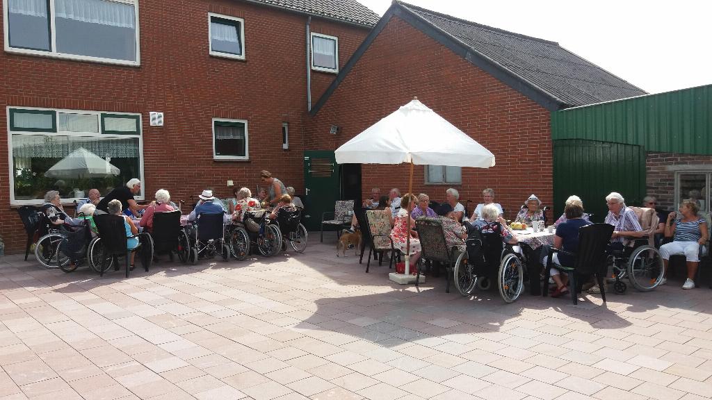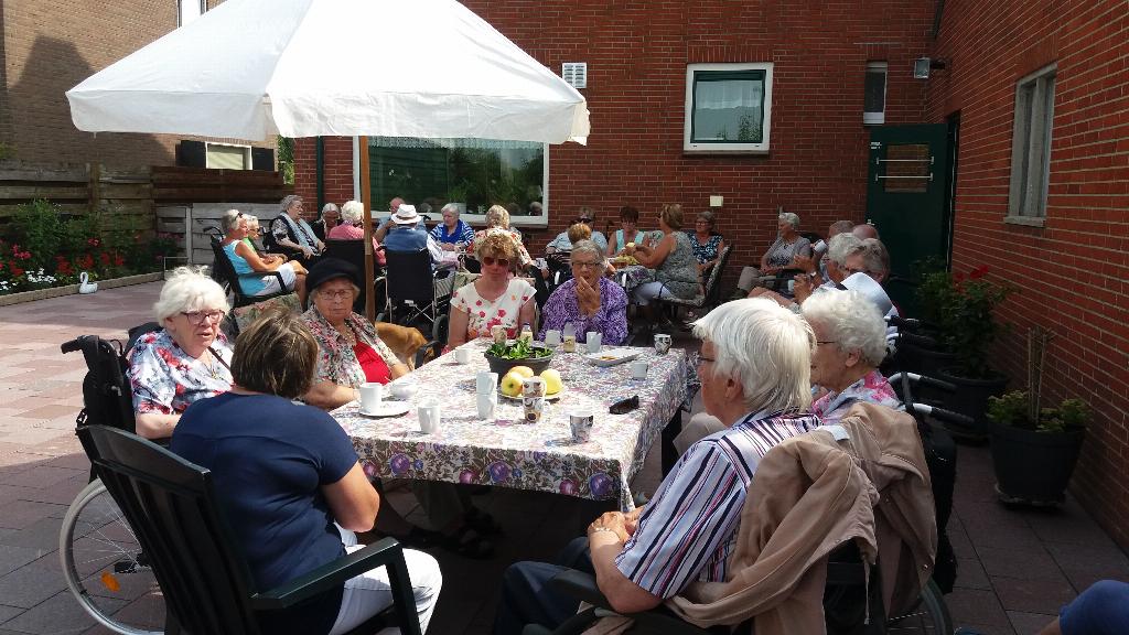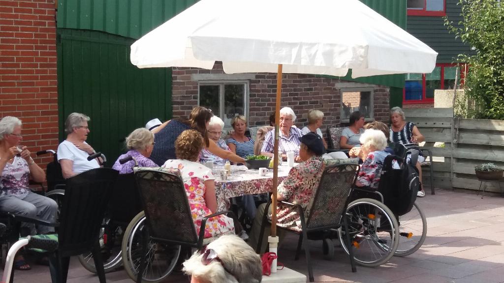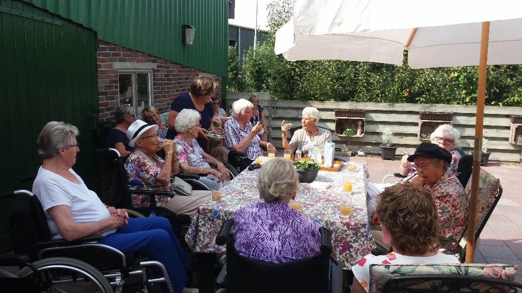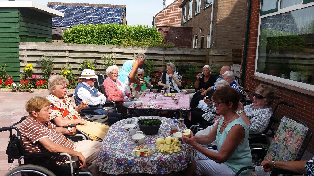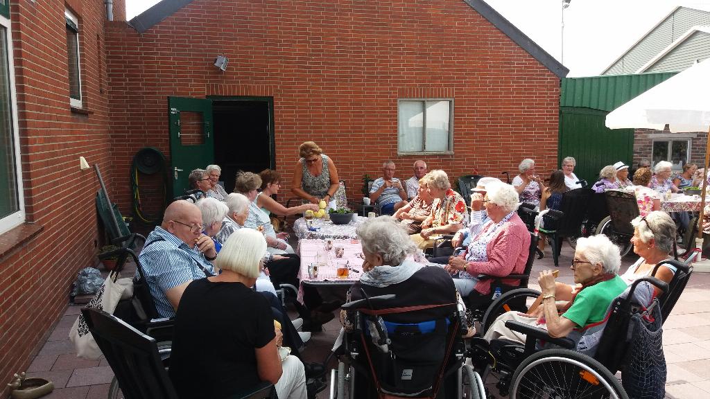 Geplaatst op:24-08-2017 Bijgewerkt op:24-08-2017 15:12 Rolstoelwandelen 23 augustusBron: S. BerendsAl vele jaren gaan wij tijdens de zomermaanden op de woensdagmiddag, als het mooi weer is, met maximaal 15 gasten rolstoelwandelen. In Montfoort zijn er verschillende families waar wij tijdens deze woensdagmiddagen welkom zijn en zij zorgen voor een hapje en een drankje voor onze gasten en ook voor onze 15 vrijwilligers (sters) Dit wordt dan ook door iedereen zeer op prijs gesteld. Deze week waren wij uitgenodigd bij het Fruitbedrijf van de familie Oostveens op Heeswijk. Rond 14.30 arriveerden wij en werden getrakteerd op appelgebak met koffie en/of thee. Ook werden er appels geschild door onze vrijwilligers die door onze gasten lekker werden opgegeten. Na een glaasje fris met wat lekkers erbij was het weer tijd om afscheid te nemen.Als verrassing kregen onze gasten en vrijwilligers een fles appelsap mee gemaakt van de appels uit eigen boomgaard. Namens De Zonnebloem Montfoort/Linschoten willen wij de Fam. Oostveens nogmaals bedanken voor hun gastvrijheid. Sjaak Berends Zonnebloem Montfoort/Linschoten