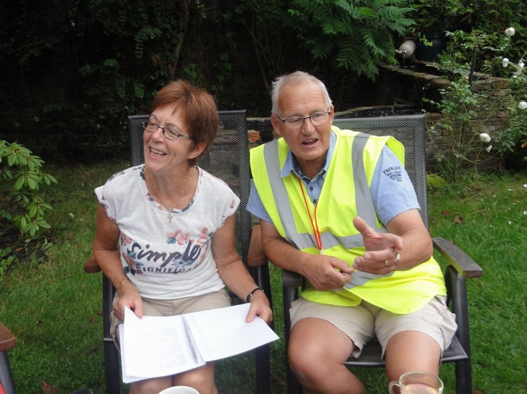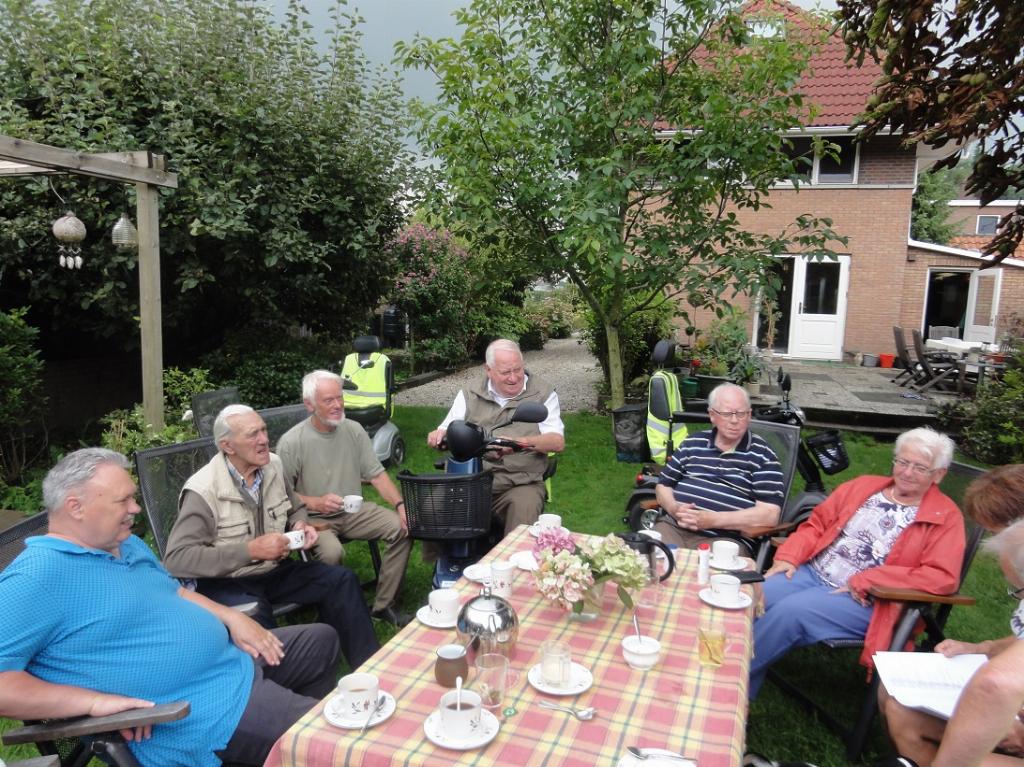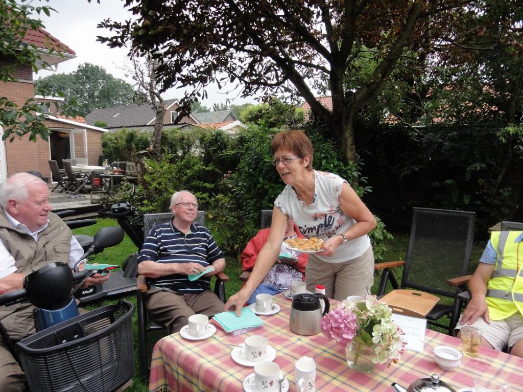 Tonny en Laus hadden een gezellig plekje voor ons gemaakt onder de bomen waar we getrakteerd werden op allerlei zelfgemaakt lekkers, we werden met recht verwend. Tonny is ook erg geïnteresseerd in de “bijnamen” van (oud)inwoners van Montfoort.