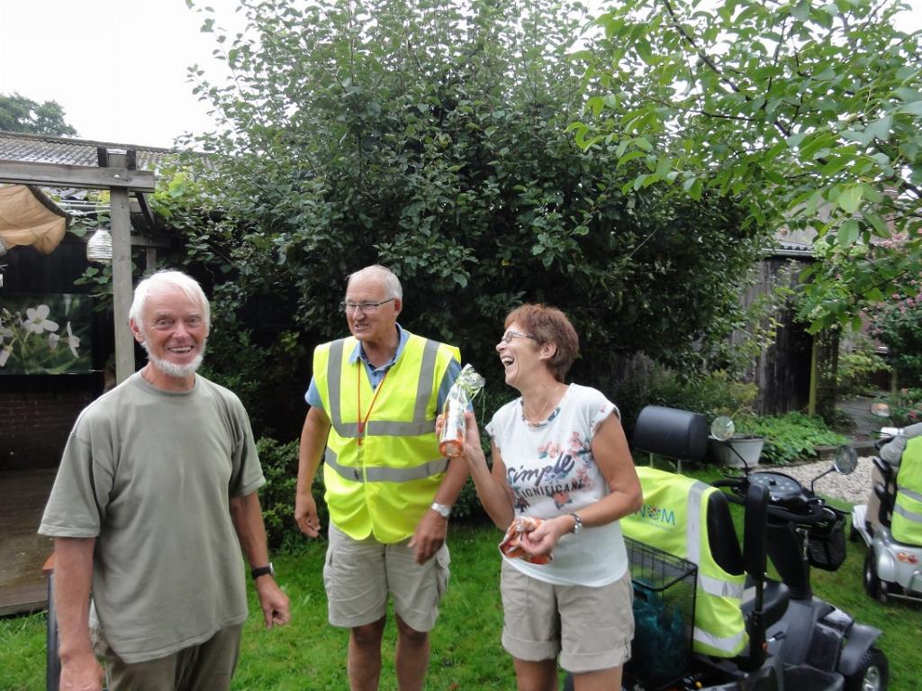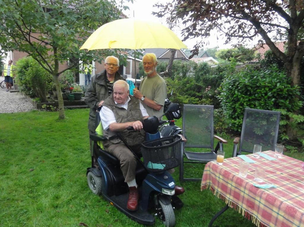 Inmiddels kwam de voorspelde regen maar daar lieten we ons niet door kisten. Na eerst nog een rondje door de boomgaard gereden te hebben met bezoekje aan hun dierenweide, namen we afscheid en bedankten we Tonny en Laus heel hartelijk voor hun geboden gastvrijheid namens alle leden en hun begeleiders Jan en Rinus, Albert en Ton. We hebben ondanks het weer een heerlijke middag gehad.