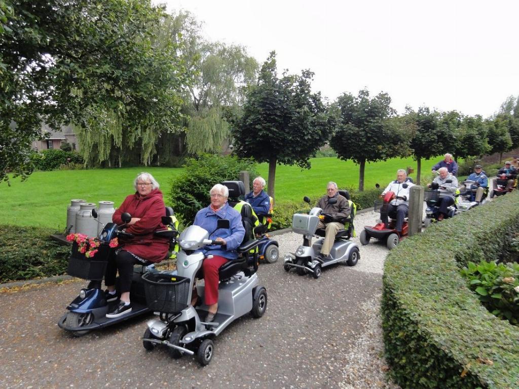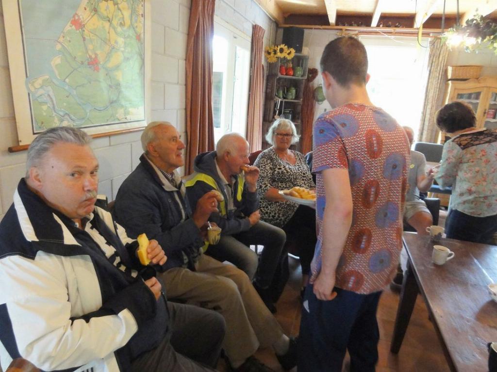 Ondanks de harde wind en de donkere luchten stonden wèl al onze leden paraat om toch op pad te gaan. Ze hadden er duidelijk zin in! We reden via de Waardsedijk naar de smalle kant van de Lange Linschoten. Een ware uitdaging vanwege het zeer slechte wegdek. Maar de hartelijkheid waarmee we begroet werden door Tineke Okkerman deed ons alles weer vergeten. Onze leden hadden het echt koud en wat waren we blij dat we bij Tineke in haar zeer ruime woonkamer binnen konden zitten. Sommigen reden zelfs met hun scootmobiel door de openslaande deuren naar binnen!! Alles kon bij Tineke!