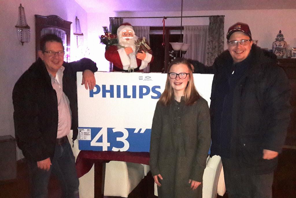 Geplaatst op:02-01-2018 Bijgewerkt op:02-01-2018 20:12 Kerst Radio Bingo 26 decemberBron: Redactie RSM Aad van der VeenAfgelopen tweede kerstdag was het weer zover. Op deze 26ste december 2017 vond weer onder leiding van de bingomasters Edwin en Dennis de traditionele kerstbingo plaats. Ook deze keer waren er, nadat er eerst 2 gewone ronden werden gespeeld, fantastische prijzen te winnen bij de superronde. Zo was er een stoomstrijkijzer, een air-fryer, een Dolce-gusto koffiezetapparaat en ook deze keer weer de prachtige 43 inch kleurentelevisie met alle toebehoren. Het geluk was deze keer vooral voor de familie van Zuylen. Nadat eerst Carla er met 2 rijtjes vol van door ging met de air-fryer (en soort systeem waar je patatjes kunt bakken zonder vet) was het tijd voor de volle kaart. De TV, u raad het ondertussen misschien ging naar haar dochter Romy. Die was nadat ze door Edwin werd gebeld bijzonder blij met haar prijs, want haar oude tv op haar slaapkamer was dringend aan vervanging toe. Een aantal dagen later togen Edwin en Dennis naar de familie om de prijzen aan de winnaressen te overhandigen, alles onder de goedkeurende blijk van de kerstman.  |