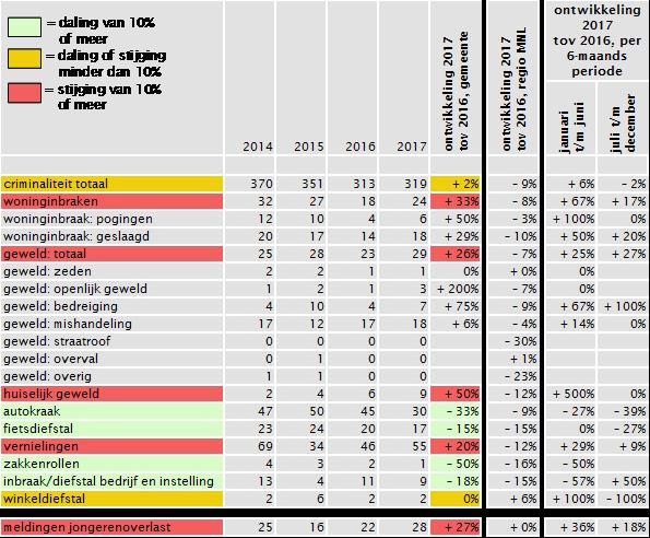 |  Na de enorme daling van de criminaliteit van de laatste jaren zien we nu een hele lichte stijging van zes aangiftes in 2017. Daarmee blijft Montfoort één van de veiligste gemeenten in Midden-Nederland. Dit blijkt uit de jaarcijfers van bureau Regionale Veiligheidsstrategie Midden Nederland (RVS). Burgemeester Van Hartskamp is realistisch: “Ik ben blij met de stabiel veilige situatie in Montfoort, maar het is zaak om de dalende trend van de laatste jaren weer te gaan realiseren. Daar gaan we alles aan doen in samenwerking met politie, inwoners en andere partners in veiligheid”. In 2017 hebben we extra aandacht gegeven aan de bedrijventerreinen. Samen met MKB-Nederland, de Veiligheidsregio Utrecht, politie en ondernemers is het Keurmerk Veilig Ondernemen behaald. Daardoor is de samenwerking, leefbaarheid en veiligheid op bedrijventerreinen verbeterd. Voor de interpretatie van de cijfers is het van belang om te realiseren dat het kleine aantallen betreft en dat een toename of afname in aantallen grote percentuele verschillen geeft. Op een aantal terreinen is de criminaliteit gestegen. Deze stijging wordt vooral veroorzaakt door het aantal woninginbraken (+ 6 aangiftes), geweld waaronder huiselijk geweld en vernielingen (+6 aangiftes). Tegenover een stijging staat er op sommige delicten ook een daling. Deze daling wordt vooral veroorzaakt door het aantal autokraken (-33,%), zakkenrollen (-50%) en inbraken in bedrijf of instelling (-18%). Ten aanzien van de stijging van het aantal meldingen van huiselijk geweld, wordt opgemerkt dat aan het begin van het jaar gesprekken zijn gevoerd met politie om het huiselijk geweld extra aandacht te geven. Naar verwachting is hierdoor de aangiftebereidheid toegenomen. In één zaak heeft dit geresulteerd in drie aangiftes. Wij vragen de Burgernet deelnemers, WhatsAppgroepen en sinds 2017 ook de Waaks! deelnemers om alert te zijn en informatie met de gemeente en de politie te delen. Achtergrond Het bureau Regionale Veiligheidsstrategie Midden Nederland (RVS) verzorgt maandelijks de criminaliteitscijfers van alle gemeenten in Midden Nederland. In januari presenteert RVS de jaarlijkse criminaliteitscijfers over het voorgaande jaar. |