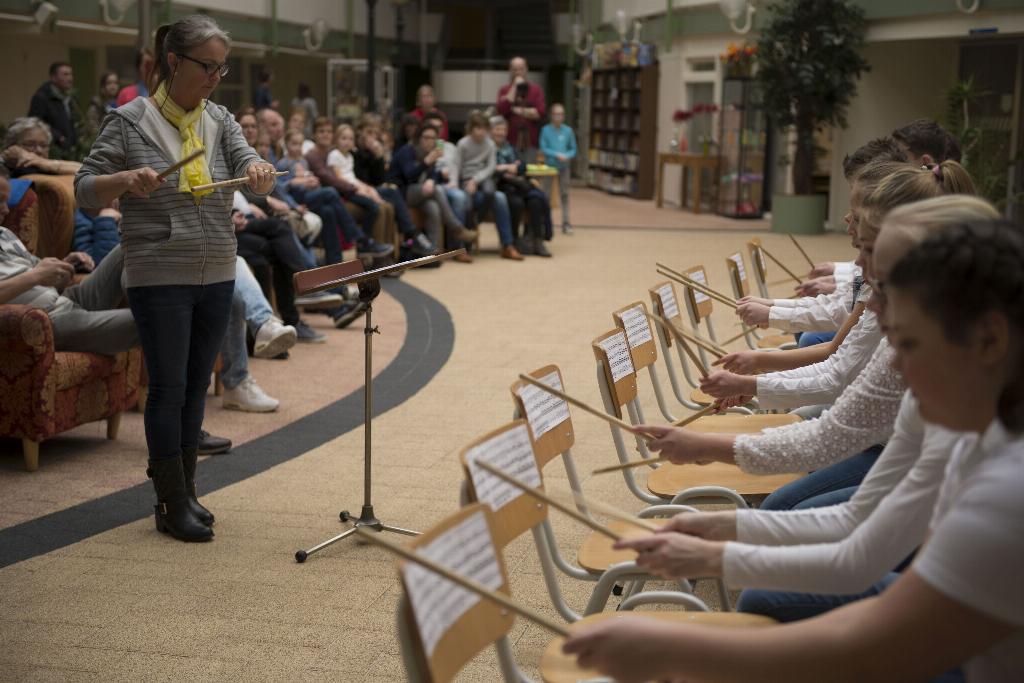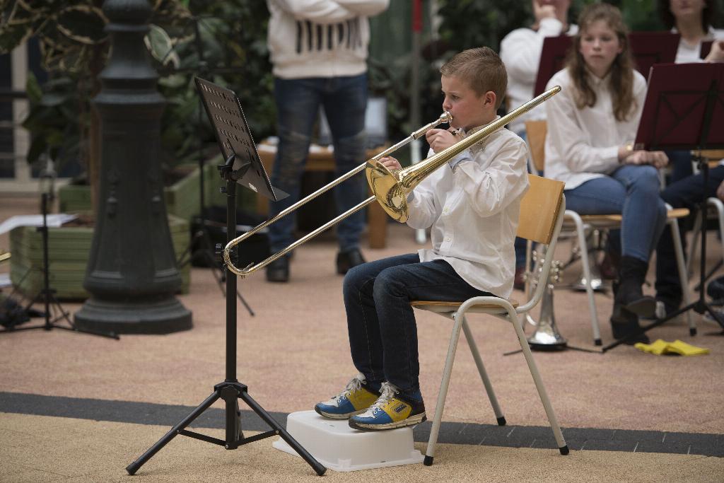 Geplaatst op:11-03-2018 Bijgewerkt op:11-03-2018 09:19 Kids in Concert wederom groot succes!Bron: Martin Kolfschoten, muziekvereniging Ons GenoegenSinds 2013 organiseert muziekvereniging Ons Genoegen “Kids in Concert”. Een concept waarbij de gehele uitvoering draait om leerlingen die zowel solo als in groepjes kunnen laten horen wat ze (al) kunnen. Bovendien wordt er op de dag een nieuw muziekstuk ingestudeerd welke diezelfde middag nog wordt uitgevoerd door de beide leerlingenorkesten. Leerling drumband op stoelen! | Het leelingenorkest olv Jan de Koning speelde o.a. muziek van de Efteling en “Any Dream will do”, het bekende stuk uit de musical Joseph and the amazing technicolor dreamcoat. De leerlingen drumband o.l.v. Betty Schrijvershof had o.a. ook een stuk ingestudeerd waarbij er op stoelen werd gespeeld, een verrassend leuke manier om muziek te maken! Bij Ons Genoegen kunnen zowel slagwerkers als bespelers van blaasinstrumenten al snel opgenomen worden in de leerlingenorkesten. Kinderen leren zo sneller samen spelen en trekken zich aan elkaar op. Een succesvolle formule welke een aantal jaren geleden door drijvende kracht Ruud de Groot is opgezet.  Leerlingenorkest | Het Atrium van het Antoniushof was weer goed gevuld met belangstellenden en de kinderen presteerden weer buitengewoon. We hebben mensen gezien die tot tranen geroerd waren van de prestaties. Bijna 50 leerlingen in opleiding bij Ons Genoegen kwamen al dan niet solo in actie deze dag. Sommigen zijn alweer enkele jaren lid maar zelfs de jongste leden kwamen al in actie.  Trombonesolo van Robin Visser | Zo kwam Maartje op de altsaxofoon en de Syrische Mikhaeil die echt nog maar een paar weken bezig zijn al in actie deze middag. Ons Genoegen is trots en prijst zich gelukkig met zoveel talent! Ons Genoegen onderneemt veel acties om de muziekbeoefening betaalbaar te houden voor iedereen. Zo worden de leerlingen van Ons Genoegen opgeleid door eigen leden, en worden instrumenten gratis in bruikleen gegeven aan de leerlingen. Natuurlijk werden ook de leraren in het zonnetje gezet en kunnen we weer terugkijken op een fantastische muzikale dag.