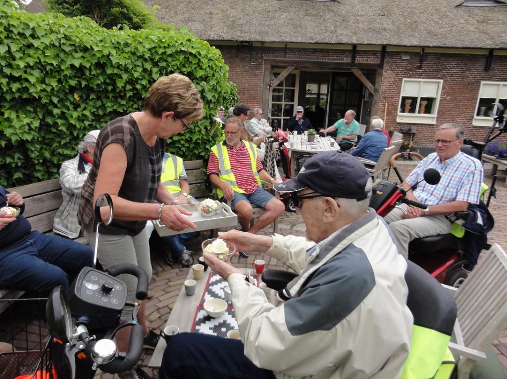 Bij de familie Okkerman stond Tineke klaar om ons hartelijk te verwelkomen. Haar heerlijke terras was een verademing want het was inmiddels flink warm geworden. We werden getrakteerd op koffie met zelfgemaakt gebak. Oh wat werd er gesmuld en toen dan ook nog haar zelfgemaakte ijs met verse vruchten geserveerd werd kon de middag al helemaal niet meer stuk! Tineke wat heb je ons verwend!
