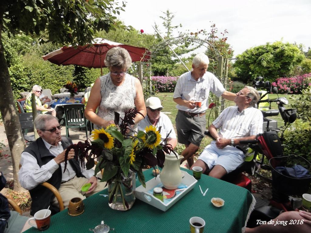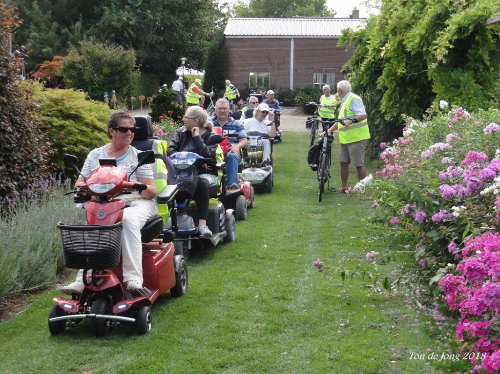 Geplaatst op:09-08-2018 Bijgewerkt op:10-08-2018 07:23 O moeder wat is het heet!Bron: Truus de Jong / Foto�s: Ton de Jong“Oohh, moeder wat is het heet”, als het ooit van toepassing was dan wel dinsdag. Dat er voor woensdag, ònze dag, 10 graden minder werd voorspeld was voor velen van ons een “eerst zien en dan geloven”. De weermannen hadden het dit keer goed en we konden met een lekker windje erbij heerlijk gaan rijden. Toch waren er door de hitte van de afgelopen tijd leden van onze scootmobielclub die zo ongelofelijk moe waren dat ze af moesten zeggen. Heel begrijpelijk, het was ook niet normaal meer, zò lang en zò heet. Via de IJsselkade reden langs het water naar de brug om daar rechts af te slaan naar het IJsselveld. Via Mastwijk kwamen we op Achthoven terecht bij Joke en Aad van de Berg die ons weer hartelijk verwelkomden. Ja wèèr, want bij Joke en Aad zijn we al hèèl veel jaren welkom. Door hun prachtige tuin met een overdaad aan bloemen, bloeiende struiken, fruit en groente werd door Aad aan ons een rondleiding gegeven. Hij wist zòveel te vertellen en de tijd vloog. Ondertussen had Joke met hulp van hun 2 kleindochters van 8 en 10 jaar de koffie/thee klaar en de dametjes hadden met Oma Joke heerlijke cupcakejes gemaakt. Later schonk Joke nog lekker koele sapjes van peren en appels uit eigen tuin. Daarna was het tijd om via Heeswijk huiswaarts te gaan. Joke en Aad en kleindochters, heel hartelijk dank dat we ook dit jaar weer welkom waren in jullie mooie tuin. Dit namens alle leden en begeleiders Bets en Joop, Rinus en Ton en Ton! 6 Foto's bij dit artikel Bekijk alle 6 foto's die bij dit artikel horen: 8aug