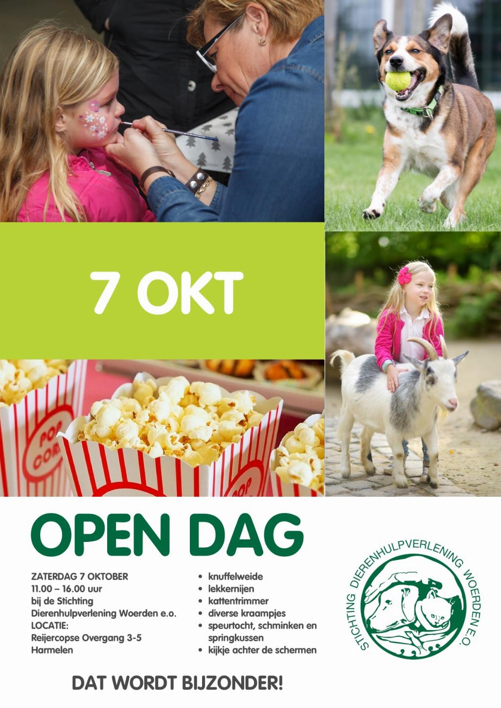 Geplaatst op:26-09-2018 Bijgewerkt op:26-09-2018 10:19 Open dag Dierenhulpverlening Woerden e.o.Bron: Dierenhulpverlening Woerden e.o.In het kader van Werelddierendag 2018 opent Dierenasiel Reijerscop op zaterdag 6 oktober haar deuren voor alle dierenliefhebbers. Iedereen is tussen 11:00 en 16:00 uur van harte welkom in Harmelen om een kijkje te komen nemen achter de schermen van Stichting Dierenhulpverlening Woerden e.o. De Stichting opent niet alleen haar deuren, ook kunnen bezoekers een tal van leerzame en gezellige activiteiten verwachten, zoals een speurtocht, een springkussen, EHBO voor honden en diverse kraampjes. Programma Tijdens de jaarlijkse open dag krijgen bezoekers de kans om het dierenasiel eens van dichtbij te bekijken. Zo is er de mogelijkheid om kennis te maken met de dieren uit het asiel en staan de vrijwilligers klaar om vragen te beantwoorden en te vertellen over het werk wat zij doen voor de Stichting. Naast diverse kinderactiviteiten staan er kattentrim demonstraties en EHBO voor honden op het programma. En om de dieren in de regio nog beter te kunnen helpen is het als bezoeker mogelijk om te doneren aan een van onze doelen. Een open dag is natuurlijk niet compleet zonder een paar bijzondere gasten: daarom kan men dit jaar genieten van een aantal geitjes en schaapjes die op bezoek komen. Mocht dit niet interessant genoeg zijn voor de kleintjes onder ons, dan kunnen zij altijd nog meedoen met de speurtocht, geschminkt worden door een van onze grimeurs, eendjes hengelen, blikgooien of hun laatste energie wegspringen in het springkussen. Kortom, genoeg redenen om op 6 oktober een bezoek te brengen aan de Open Dag in Harmelen. Zien we u daar? Meer informatie Nieuwsgierig geworden? Meer informatie over de Open Dag is te vinden op de website: http://dierenhulpverleningwoerden.nl/ of neem contact op via PR@dierenhulpverleningwoerden.nl. Locatie Dierenasiel Reijerscop Reijerscopse Overgang 5