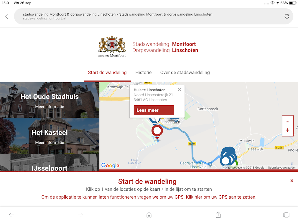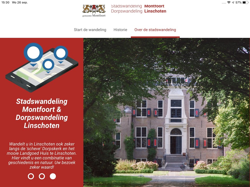 Geplaatst op:26-09-2018 Bijgewerkt op:26-09-2018 19:07 Montfoort op de kaartBron: Redactie Aad van der Veen Met trots presenteerde burgemeester van Hartskamp op 26 september de nieuwe wandel-app voor zowel Linschoten als Montfoort. Door middel van deze app kunnen toeristen, maar uiteraard ook onze eigen inwoners op een simpele wijze alle bezienswaardigheden in onze beide kernen bekijken. De app is op dit moment alleen nog in het Nederlands, maar komt straks ook nog een Engelstalige versie. De app is via google te vinden als https://stadswandelingmontfoort.nl of https://dorpswandelinglinschoten.nl Op beide versies kunnen je de 2 kernen terugvinden. Tot slot sprak de burgemeester haar dank uit voor de input die Janneke Severs en Peter Versloot hebben geleverd en tevens aan Draads media, die de app heeft ontwikkeld. Daarna kreeg Angela van Rooijen (ambtenaar recreatie en toerisme) het woord om de technische details uit te leggen. Iedereen ging meteen aan de slag om de app te bekijken. Via de informatieborden in Montfoort en Linschoten zijn ook alle details terug te vinden. Daarna ging het gezelschap de app in de praktijk uitproberen. De groep startte met de smartphones in de hand bij het stadskantoor en als tussenstop was het de Commanderije. We eindigden bij de IJsselpoort. Een handige app dus om uw gemeente nog beter te leren kennen.  |  |