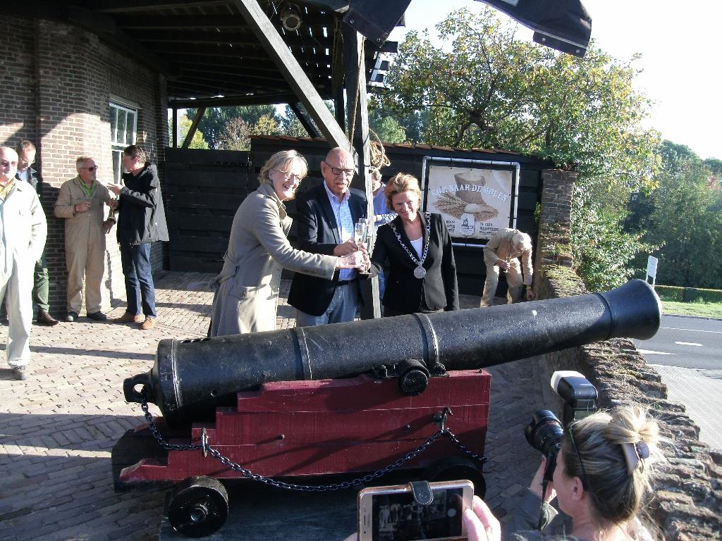 Geplaatst op:19-10-2018 Bijgewerkt op:19-10-2018 16:58 Gezicht van MontfoortBron: Nettie Kuijer, redactie Radio Stad MontfoortVrijdag 19 oktober werd het vernieuwde voorterrein van molen de Valk feestelijk in gebruik genomen. Het is drastisch vernieuwd en bevat weer één van Montfoorts oude verdedigingswerken: het eeuwenoude kanon is weer in ere hersteld en stond te glanzen in de zon. Dat kanon, wat in het verre verleden deel uit maakte van Montfoorts verdedigingswerken, stamt uit 1832 en heeft jaren lang gestaan in de Molenstraat op de oude stadsmuur welke toentertijd nog doorliep tot aan de Lieve Vrouwengracht. Nu bij de renovatie van het voorterrein was het een mooi moment om dat kanon weer in ere te herstellen. Door molenaar Hein Verhoef is een passende affuit gemaakt van hout, wat beschikbaar is gesteld door het Utrechts Landschap. Op het terras van de molen staan gezellige houten tafels en banken die uitnodigen om plaats te nemen en te genieten van het mooie uitzicht over Montfoort. Het voorterrein is door Hoveniersbedijf Jasper de Jong uit Montfoort stijlvol aangelegd met o.a. een prachtige Windroos met als middelpunt een molensteen. Deze molensteen is afkomstig uit de restanten van het oude hotel “de Zwaan.” De windroos is omringt door oude kasseien die zijn gebruikt bij het aanleggen van de Provinciale weg in de 1e helft van de dertiger jaren. Bij de recentelijke renovatie van de Provinciale weg kwamen deze kasseien van onder het asfalt boven drijven. Ook de bijbehorende letters N-O-Z-W die de windrichting aangeven zijn gemaakt van deze kasseien. Kortom, bij het “Gezicht van Montfoort” komt de historie weer tot leven. 7 Foto's bij dit artikel Bekijk alle 7 foto's die bij dit artikel horen: Molen