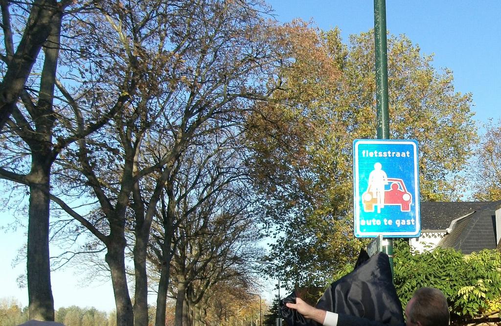 Geplaatst op:08-11-2018 Bijgewerkt op:08-11-2018 09:26 Opening fietsstraat DoeldijkBron: Nettie Kuijer, redactie Radio Stad MontfoortDonderdag 8 november heeft Wethouder Ivo ten Hagen in samenwerking met het Wellantcollege de eerst fietsstraat in Montfoort officieel geopend. Na de openingshandeling werd door leerlingen van het Wellantcollege met een sjabloon met speciale krijtverf ‘zet je licht aan’ op de fietsstraat gespoten. Aansluitend werden de gasten uitgenodigd bij het Wellandcollege Het aantal fietsers op de Doeldijk is de afgelopen jaren flink toegenomen. Om de positie van fietsers te verbeteren heeft de gemeente Montfoort de Doeldijk heringericht als fietsstraat. Een fietsstraat is een straat die ingericht is als fietsroute en waarop auto’s als gast zijn toegestaan. De Doeldijk is hiermee aantrekkelijker, comfortabel en veiliger geworden voor de vele scholieren van het Wellantcollege en voor de vele fietsers die hier dagelijks gebruik van maken. 14 Foto's bij dit artikel Bekijk alle 14 foto's die bij dit artikel horen: Fietsstraat