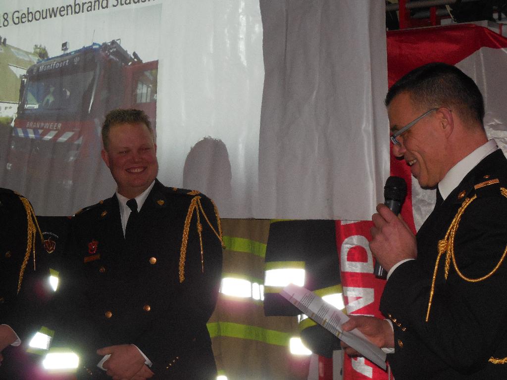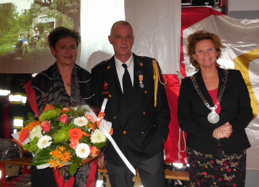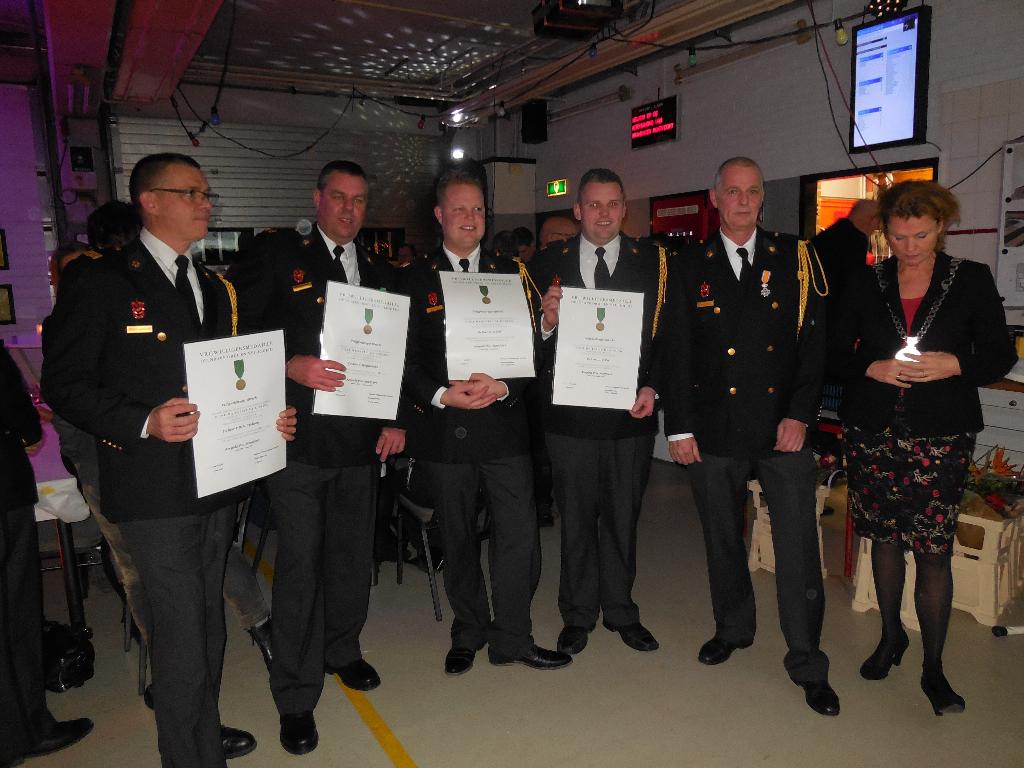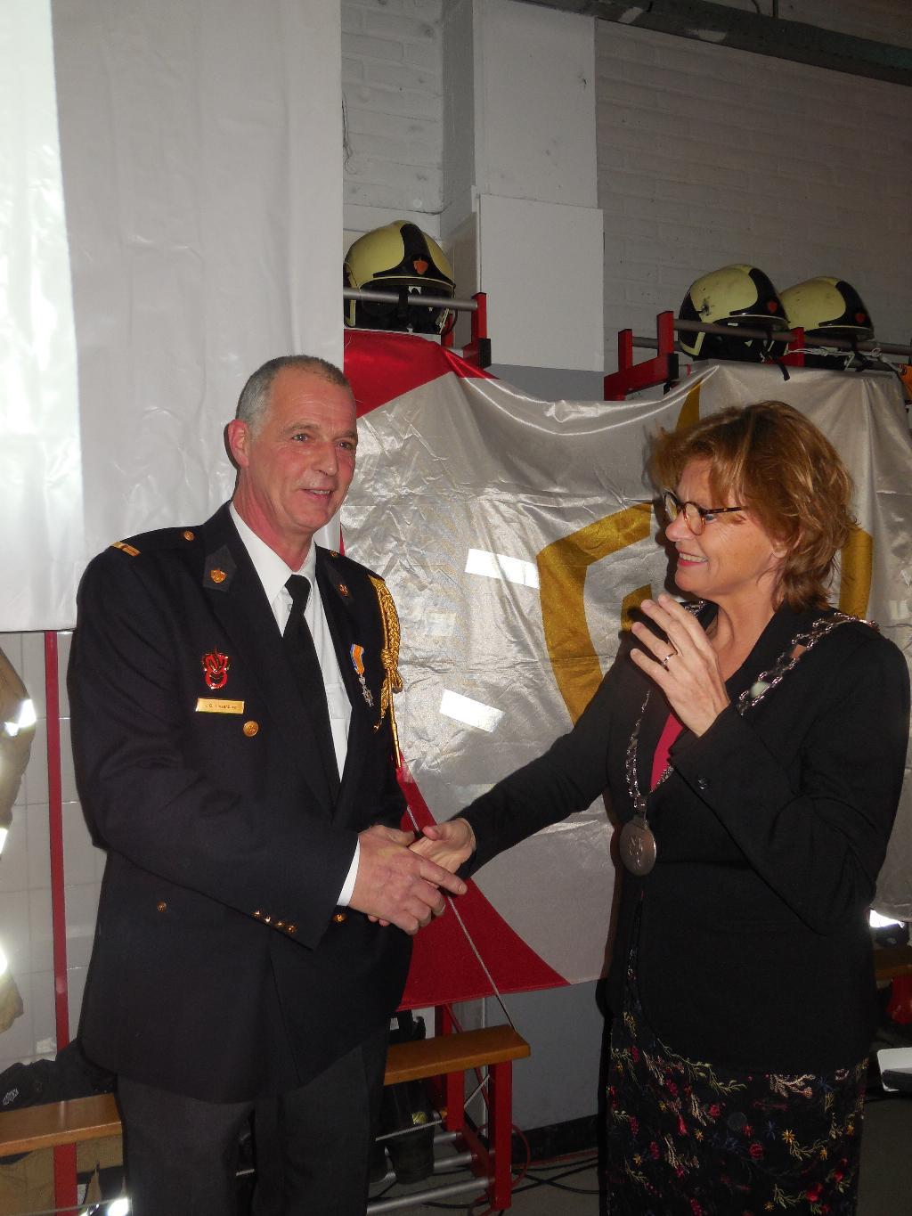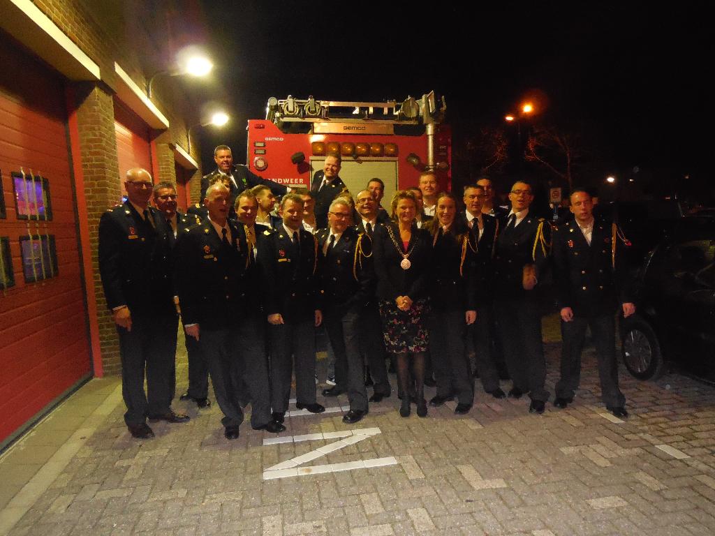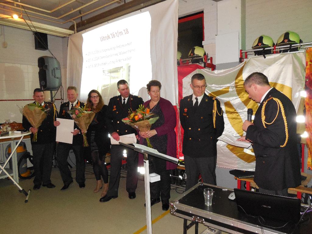 Hierna nam Renzo Kemp het woord om de postcommandant Paul Ebskamp de oorkonde voor 25 jaar trouwe dienst te overhandigen. Er werden ook nog 2 nieuwe korpsleden begroet en werd er afscheid genomen van Albert Werkhoven. Hierna kreeg burgemeester van Hartskamp het woord. Tot ieders verrassing riep zij John en Jacqueline Lissenburg naar voren en sprak vervolgens de volgende woorden: Op zaterdag 15 december heeft het Zijne Majesteit de Koning behaagt de heer John Lissenburg uit Montfoort met de Koninklijke Onderscheiding “Ridder in de orde van Oranje-Nassau” te benoemen voor al zijn werk voor de vrijwillige brandweer Montfoort gedurende 25 jaar. De kinderen Lissenburg waren uiteraard ook aanwezig bij dit moment.Na deze verrassende afsluiting van het officiële gedeelte, was iedereen in de gelegenheid alle jubilaressen en in het bijzonder John te feliciteren met hun benoemingen en ging iedereen, ondanks de snijdende koude oostenwind naar buiten voor de groepsfoto.