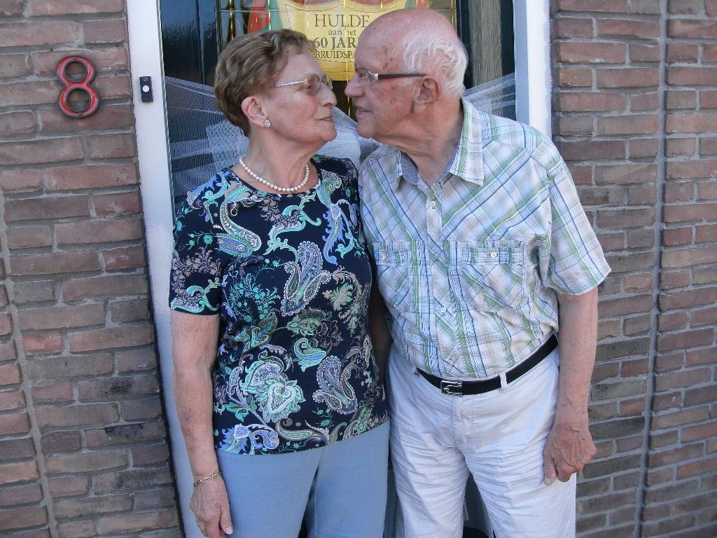 Geplaatst op:23-07-2019 Bijgewerkt op:23-07-2019 20:23 Diamanten paar in MontfoortBron: Nettie Kuijer, redactie Radio Stad MontfoortDonderdag 23 juli 1959 was het een zeer warme dag. Gerda Jongeling en Dirk Verheul trouwden die dag voor de wet in Montfoort. Dinsdag 23 juli 2019 ontving het briljanten paar burgemeester Van Hartskamp- De Jong in hun feestelijk versierde huis aan de Achterdijk. De zon brandde genadeloos op hun prachtige tuin, door Dirk met liefde onderhouden. Met 34 graden in de schaduw werd uitgeweken naar de koelere huiskamer. Genietend van een glas gemeentepils vertelde Dirk hoe hij jaren geleden verliefd werd op dat meisje dat hij al vaak ontmoet had in Montfoort. Op de Montfoortse kermis vonden zij elkaar. Eerste liefde voor beiden, en nu al 60 jaar gelukkig getrouwd. Beiden werkten jarenlang voor de stoffeerderij van de Kiela Metaalwarenfabriek in Driebruggen. Dirk in Driebruggen en Gerda thuis. In de bijkeuken stond een zware fabrieksnaaimachine waar Gerda de bekleding naaide: leer, skai, een doordringende geur waar de kinderen weleens over klaagden.