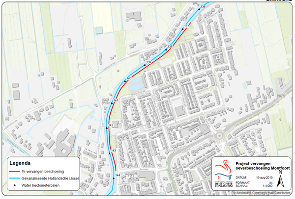 Geplaatst op:21-08-2019 Bijgewerkt op:21-08-2019 10:04 Waterschap vervangt beschoeiing langs oeverBron: gemeente MontfoortHoogheemraadschap De Stichtse Rijnlanden vervangt de beschoeiing van de oever langs de Gekanaliseerde Hollandsche IJssel (GHIJ) in Montfoort. Het gaat om het gedeelte tussen de Boslaan/Waterpoort en de Johan de Ridderlaan. Aannemer Peek Bouw & Infra BV uit Houten voert de werkzaamheden uit. Het werk start op maandag 26 augustus en duurt tot medio november 2019. De aannemer verwijdert de oude beschoeiing vanaf een ponton op het water en trilt een nieuwe stalen damwand de grond in. Hij werkt van 07:00 uur tot 17:00 uur. Er kan dan enige geluidshinder ontstaan, door het trillen van de damwand. Geprobeerd wordt de hinder zoveel mogelijk te beperken. Wandelpad Het wandelpad is tijdens de werkzaamheden niet altijd overal toegankelijk voor wandelaars. Het afgesloten gedeelte wordt afgezet met bouwhekken en bebording. Tijdelijk beperkte aanlegplaatsen Op een gedeelte van het traject zijn 3 x 24 uurs ligplaatsen voor de recreatievaart. Er zijn tijdelijk beperkte aanlegmogelijkheden. De aannemer beperkt de overlast zoveel mogelijk door bij de Johan de Ridderlaan te starten met het werk. Hergebruik houten planken Duurzaamheid is een belangrijk speerpunt voor het waterschap. Daarom worden de houten planken uit de oever opnieuw gebruikt bij projecten in het Kromme Rijngebied. De planken kunnen niet in Montfoort worden hergebruikt. Ze zijn te kort, omdat het gedeelte boven water in slechte staat is en afgezaagd wordt. Opknappen GHIJ Het waterschap gaat de komende jaren veel werk verrichten in en langs de GHIJ. Er wordt gebaggerd, sluizen worden gerenoveerd en kaden en oevers krijgen een opknapbeurt.