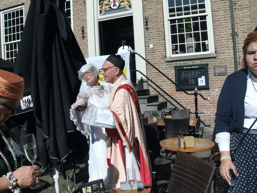Geplaatst op:14-09-2019 Bijgewerkt op:16-09-2019 07:27 Open monumentendag Montfoort en LinschotenBron: Nettie Kuijer, redactie Radio Stad Montfoort"Plekken van plezier en trouwen," daar ging het om op 14 september. De SOM (Oudheidkamer) richtte in de grote hal van het Huis van Montfoort een expositie in over trouwen in Montfoort in vroeger jaren, met trouwfoto's, trouwkleding, beeldmateriaal en verhalen, vaak beschikbaar gesteld door inwoners van Montfoort.  Een rondreizend straattheater vermaakte het publiek met een boerenbruiloft |  | En voor de jeugd was er een etalagespeurtocht, waarbij de winkeliers verbluffend mooie uitstallingen hadden gecreëerd. In Linschoten liep het halve dorp in streekdracht. De sfeer van het verleden was te horen, te ruiken, te proeven en te zien. Er werd een boerenbruiloft met vele figuranten uitgebeeld, compleet met rijtuigen. De NaZomerMarkt in folklore op de Hoge Werf schitterde in de zon. Hulde voor de vele vrijwilligers afkomstig uit de plaatsen Montfoort en Linschoten, die zich georganiseerd hebben in de Stichting Open Monumentendag Montfoort-Linschoten! 39 Foto's bij dit artikel Bekijk alle 39 foto's die bij dit artikel horen: Open monumentendag