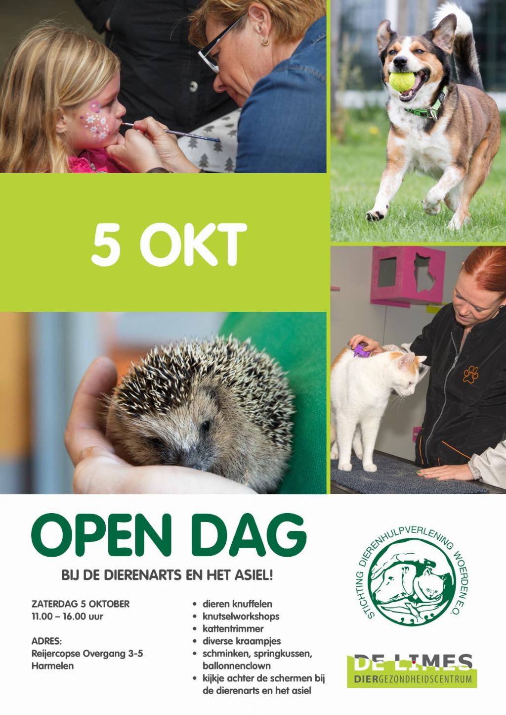 Geplaatst op:24-09-2019 Bijgewerkt op:24-09-2019 07:34 Open dag Dierenhulpverlening en DGC de LinesBron: Elmar Hilkmann PR Dierenhulpverlening Woerden eoEen kijkje nemen bij de dierenarts of in de dierenambulance, asieldieren ontmoeten of zelf aan de slag gaan met gezonde dierensnacks maken: het kan tijdens de Open Dag! In het kader van Werelddierendag 2019 openen Dierenasiel Reijerscop en Diergezondheidscentrum De Limes op zaterdag 5 oktober namelijk hun deuren voor álle dierenliefhebbers. Iedereen is dan tussen 11.00 en 16.00 uur van harte welkom.  | Programma Maar wat te verwachten? Tijdens de Open Dag worden tal van gezellige en leerzame activiteiten georganiseerd voor jong én oud. Altijd al nieuwsgierig geweest naar de dieren in het dierenasiel? Dan mag je deze dag zeker niet missen. Onze katten, honden, konijnen en vogels staan namelijk in opperste paraatheid om jou te ontmoeten. Ook kun je de dierenarts op de voet volgen richting de operatiekamer om het fijne te weten te komen over echo’s en röntgenfoto’s bij dieren. Toch liever zelf aan de slag? Ook hiervoor ben je op de open dag aan het juiste adres: samen met onze vrijwilligers kun je je eigen speeltjes en snacks maken voor jouw huisdier. Een open dag is natuurlijk niet compleet zonder een paar bijzondere gasten: daarom kan men dit jaar een kattentrim demonstratie bijwonen, een ballonnenclown die dierenfiguren maakt en staan onze vrijwilligers voor je klaar om al jouw vragen te beantwoorden en je in geuren en kleuren te vertellen over het werk wat zij doen. Mocht dit niet interessant genoeg zijn voor de kleintjes onder ons, dan kunnen zij altijd nog meedoen met een leerzame speurtocht door het asiel, geschminkt worden door een van onze grimeurs of hun laatste energie wegspringen in het springkussen. Kortom, genoeg redenen om op 5 oktober een bezoek te brengen aan de Open Dag in Harmelen. Zien we jou daar? Meer informatie Nieuwsgierig geworden? Meer informatie over de Open Dag is te vinden op de website: http://dierenhulpverleningwoerden.nl/ of neem contact op via PR@dierenhulpverleningwoerden.nl.