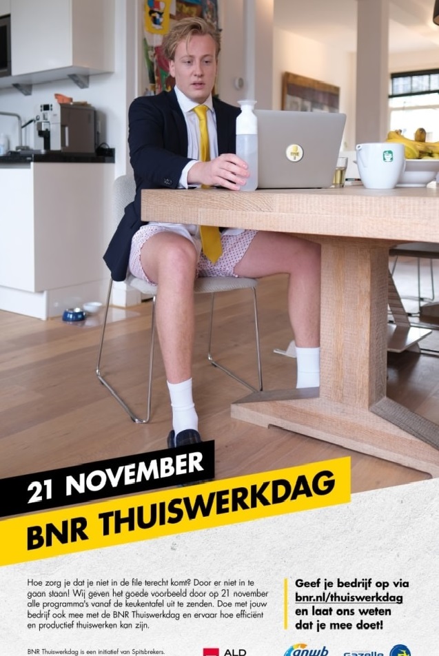 Geplaatst op:10-10-2019 Bijgewerkt op:10-10-2019 08:23 BNR Nieuwsradio daagt Nederland uit op 21 november thuis te werkenBron: FD MedisgroepBNR Nieuwsradio organiseert op donderdag 21 november voor het eerst de ‘BNR Thuiswerkdag’. Op die dag blijven de studio’s van de radiozender leeg en werken de redacties van de programma’s thuis. Onder meer presentatoren Bas van Werven, Roelof Hemmen en Jörgen Raymann maken hun uitzending thuis.  | BNR Thuiswerkdag is onderdeel van Spitsbrekers, een competitie tussen bedrijven in strijd tegen de files. Omdat thuiswerken een goed middel is om files te verminderen, roept BNR ondernemend Nederland op om 21 november ook thuis te werken. ‘Wij geven het goede voorbeeld en we hopen dat het bedrijfsleven volgt’, zegt hoofdredacteur Sjors Fröhlich van BNR Nieuwsradio. Aanmelden kan via bnr.nl/thuiswerkdag Files Met de thuiswerkdag voert BNR de strijd op tegen het filemonster. Het aantal files in Nederland blijft maar groeien. Naar verwachting zorgen ze dit jaar voor 67 miljoen verliesuren. Wanneer werknemers die thuis kunnen werken dat af en toe doen, kan dat files schelen. ‘Daarom is de BNR Thuiswerkdag vooral een oproep om thuiswerken eens te proberen. We willen het gesprek tussen werknemer en werkgever op gang helpen: Hoe zouden we vaker thuis kunnen werken?’, zegt Fröhlich Lege studio’s bij BNR Normaal gesproken maakt BNR vanaf zes uur ‘s ochtends tot zeven uur ‘s avonds live radio vanuit de studio in Amsterdam. Op 21 november worden alle programma’s vanuit het huis van de presentatoren uitgezonden. Ook de redacteuren werken vanuit hun eigen huis. ‘Het wordt logistiek gezien een enorme uitdaging, maar als het BNR lukt dan moeten toch veel bedrijven óók thuiswerken mogelijk kunnen maken’, zegt Fröhlich. Over Spitsbrekers De BNR Thuiswerkdag is onderdeel van Spitsbrekers, een initiatief van BNR Nieuwsradio en wordt mede mogelijk gemaakt door ALD Automotive, ANWB Zakelijk en Gazelle. Spitsbrekers heeft als doel bedrijven te inspireren en te activeren om medewerkers uit de file te halen en zakelijk Nederland weer in beweging te krijgen. Het eerste seizoen van de competitie werd eind september gewonnen door Medisch Spectrum Twente.