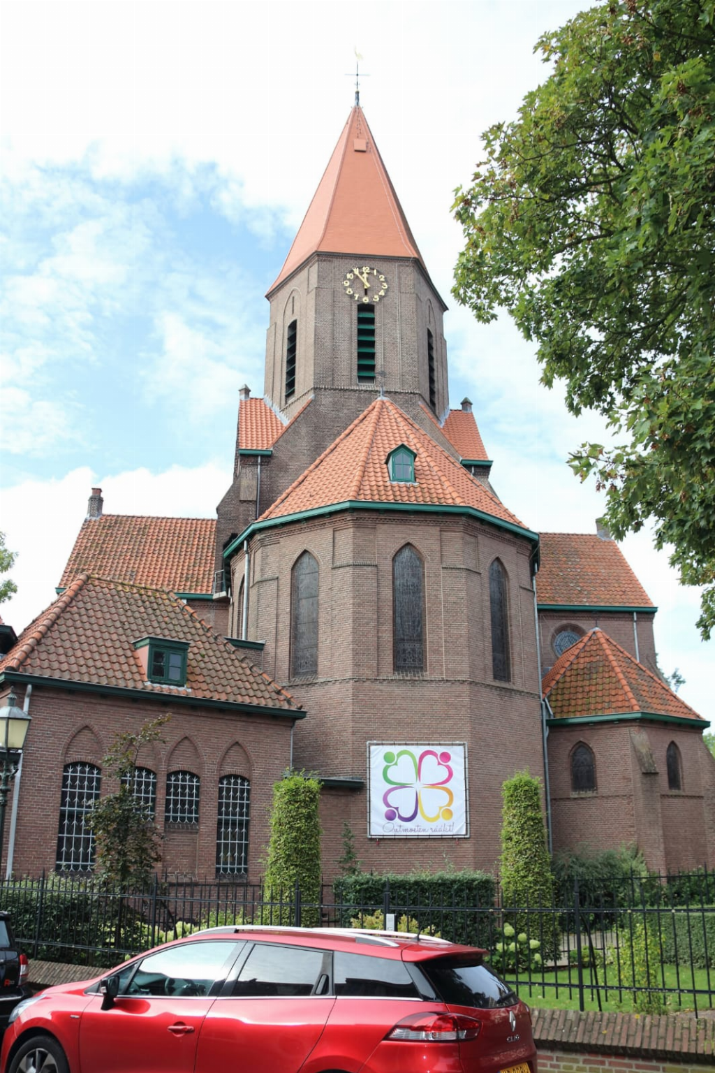 Eerst in wisselende samenstellingen van geloofsgenoten tijdens de eerste fase van bijeenkomsten rond Vitaliteit, daarna op weg met een groep van 9 mannen en vrouwen, jong en wat ouder, die toekomst zagen en zien in de geloofsgemeenschap in fase twee en inmiddels ook drie. Met geduld, behoedzaamheid voor “ons” proces, scherpte, doelgerichtheid én kennis van zaken werd deze vitaliteitsgroep daarin begeleid door pastor Marion Korenromp, vaak samen met extern adviseur Henk Brussel. Er werd de afgelopen vier jaren een boeiende en belangrijke ontwikkeling doorgemaakt op weg naar (meer) vitaliteit. Er werd ontdekt dat het ons vooral om Ontmoeten gaat en als motto werd omarmd “Ontmoeten ráákt!”. Daarmee willen we de toekomst in, om onder mensen aanwezig te zijn waar Ontmoetingen er toe doen, binnen en buiten de kerk. Met als startschot het Dank-je-wel weekend van 4, 5 en 6 oktober 2019 zal de geloofsgemeenschap na al die jaren eindelijk de vruchten kunnen gaan plukken van dit proces. Nu is het tijd om die ruimte van de Ontmoeting handen en voeten te gaan geven...  |  | Nadat iedereen sinds de jaarmarkt van 24 augustus aan het puzzelen was geslagen om zodoende het nieuwe motto te ontfutselen, werd het vrijdagavond 4 oktober onthuld, tezamen met het gloednieuw ontworpen logo . Uit volle borst werd vervolgens het lied meegezongen: “Blijf niet staren op wat vroeger was. Sta niet stil in het verleden. Ik, zegt Hij, ga iets nieuws beginnen; het is al begonnen, merk je het niet?”. Daarna kreeg iedereen de gelegenheid aan den lijve te ervaren dat Ontmoeten ráákt! Niet in de laatste plaats tijdens de gezellige na-borrel. De eerste van vele activiteiten die het programma gaan vormen voor een vitale toekomst. De banner met logo en motto buiten op het kerkgebouw is een start om Vitaliteit vorm te geven binnen en buiten onze geloofsgemeenschap