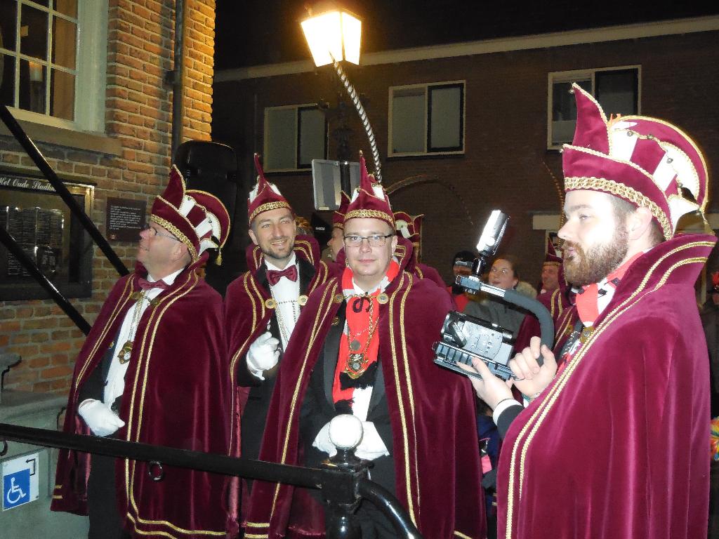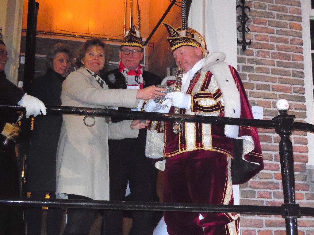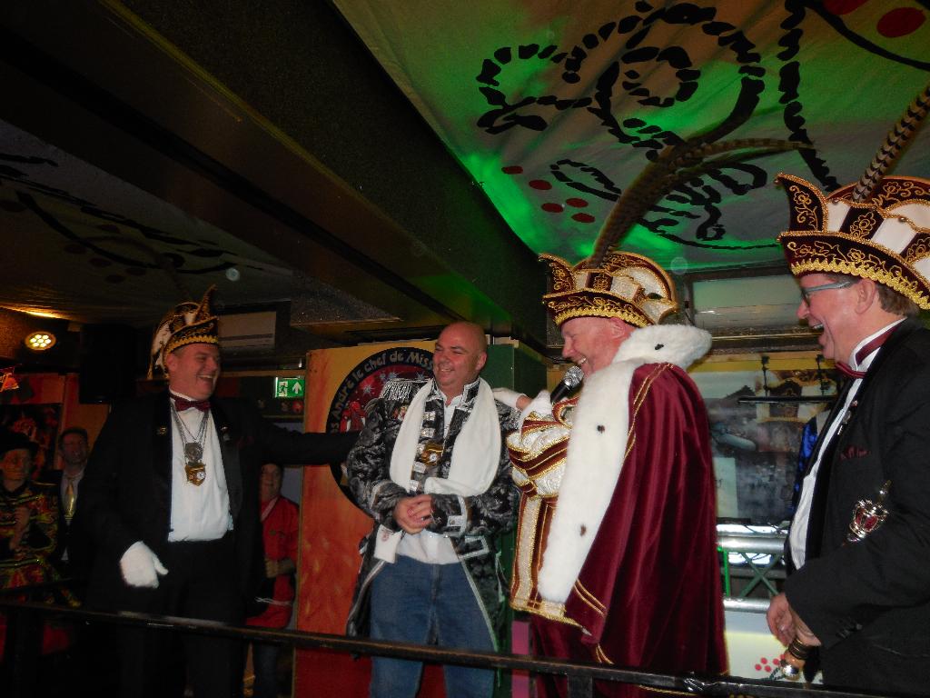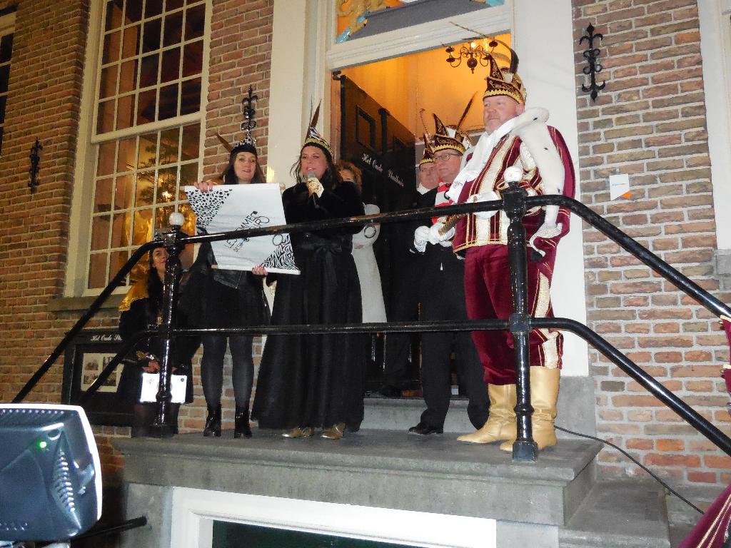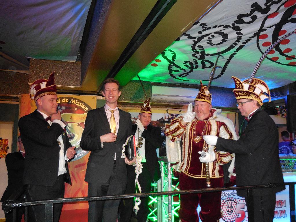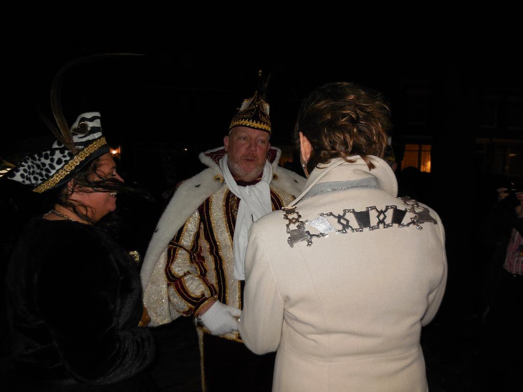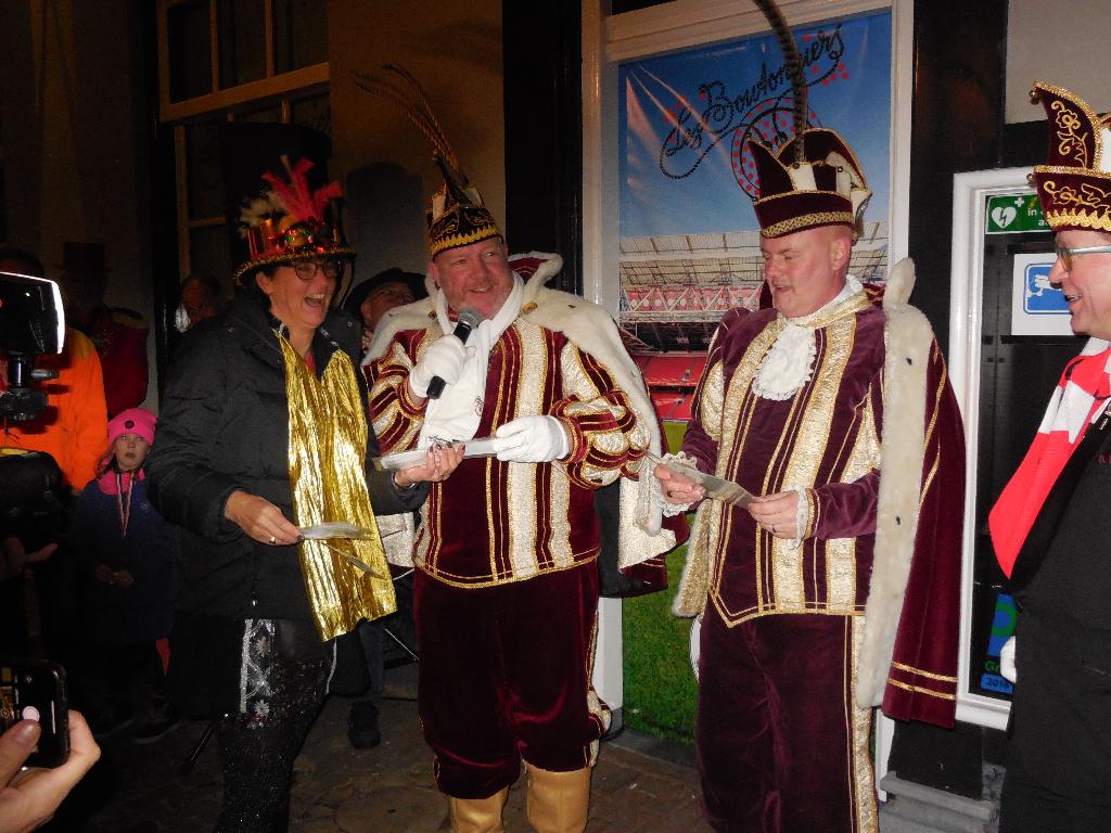 Hierna ging men al snel naar de leutbunker van Les Boutonniers, de Heeren van Montfoort. Maar voordat we naar binnen mochten moest de Prins nog enkele zeer ingewikkelde vragen over de sport golfen beantwoorden. Met de nodige ondersteuning van zijn echtgenote, was dat zo gepiept en konden we binnen even opwarmen. Maar niet eerst nadat hij een prachtige jas kreeg van zijn eigen voetbalkluppie “Ajax”.