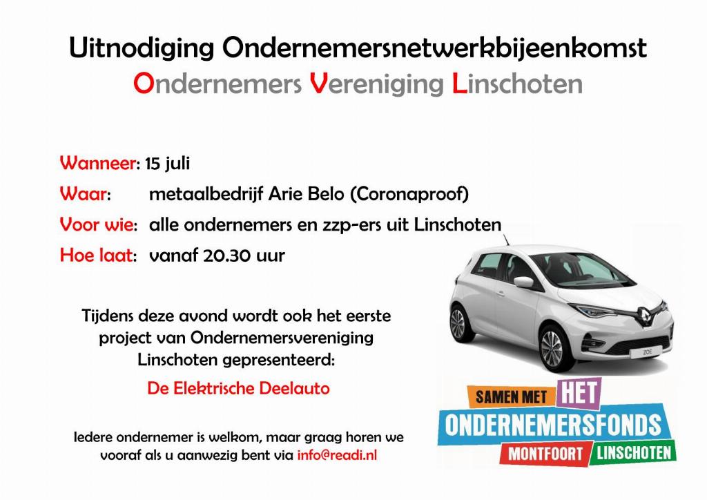 Voor de Ondernemersvereniging Linschoten is dit een aanleiding om een elektrische deelauto in Linschoten te plaatsen, die door iedereen na reservering via een app tegen een kleine vergoeding gebruikt kan worden. De auto zal 24 uur per dag 7 dagen per week te gebruiken zijn.